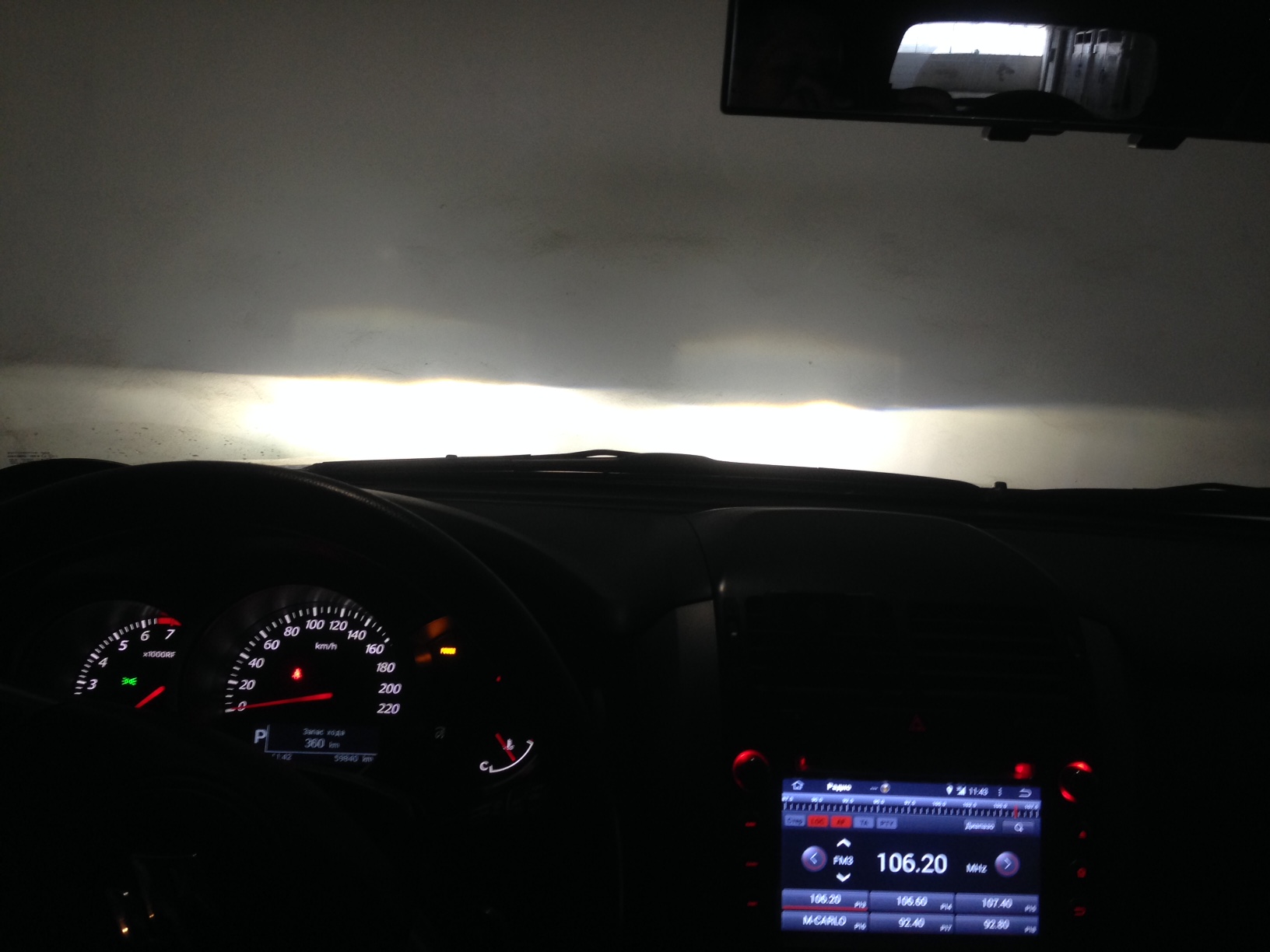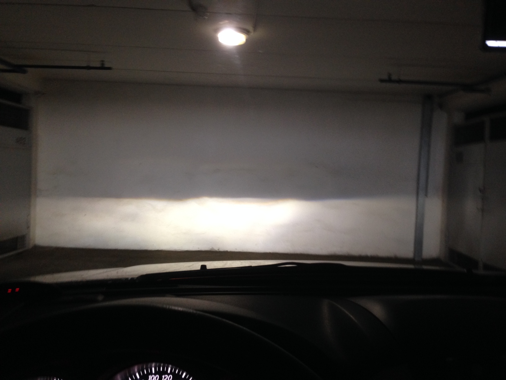 Продолжаю рассказ. Переходники так и не поставил, езжу на временных проставках, может где и не ровно прилегают лампочки. Пофоткал в полумрачном гараже световое пятно и свето-теневую границу, хочу показать. Может кто подскажет что надо подрегулировать?