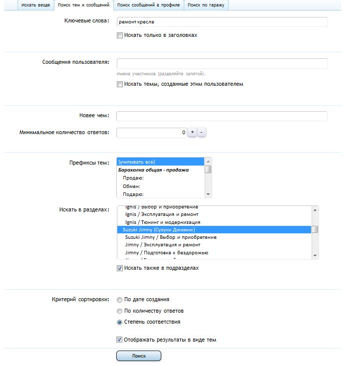 Нажимаем левым щелчком на "Поиск", выбираем "Больше", далее выбираем меню на рисунке. Вбиваем "Ключевые слова", выбираем "Искать только в заголовках" (если не находит галочку убираем), в "Искать в разделах" ищем нужный нам раздел или подраздел, ставим галочку на "Отображать результаты в виде тем", жмём поиск. Ну и включаем фантазию при выборе ключевых слов )))