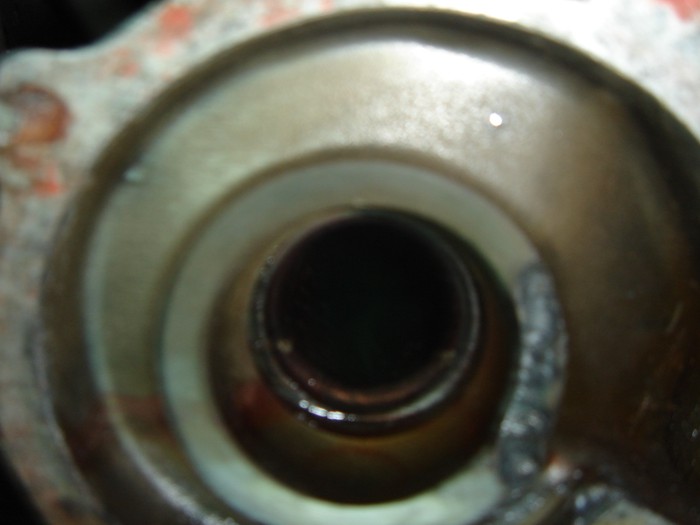 Снял помпу, тоже проблема - выщерблен край цилиндра, над которым вертится крыльчатка, похоже на кавитацию. Не знаю как заделать, неужели только сваркой со снятием блока? Есть задумки про стальные полоски на заклёпках.