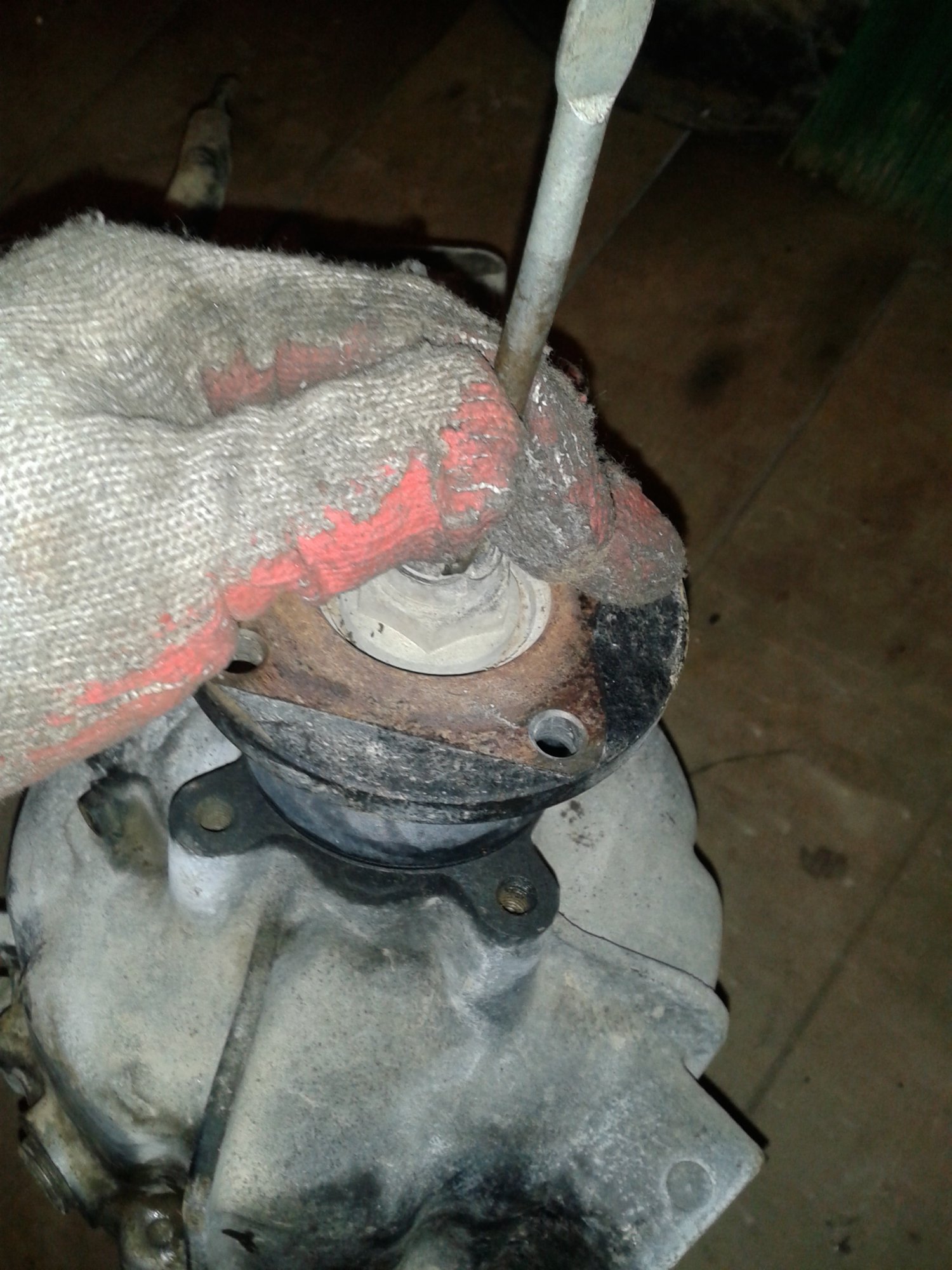 Видим следующую картину. Чтобы отстегнуть стопор ручки надо прижать его вниз и повернуть против часовой стрелки. Тут есть нюанс. Всем этим раздаткам уже по 20 с хвостиком лет. Материал из которого сделано колечко под ручкой, что-то типа полиуретана, от старости разваливается на части. Тогда отстегивание ручки несколько усложняется, но с помощью тупого зубила и нежных пошлепываний молотком, стопор все же сдается.