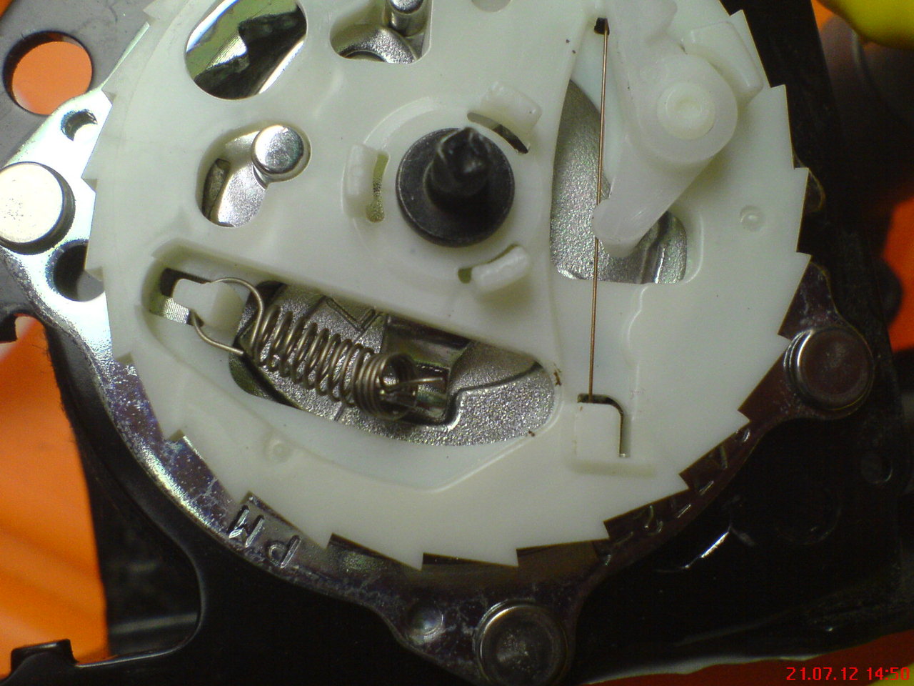 Третий механизм - пимпочка, двигаемая кружочком с вырезами (на первой фотке он между катушкой и пассатижами), возвращаемая назад упругой проволочкой (видна на первой и второй фотке, прямая такая) и упирающаяся в другой зубчатый венец (внутренний, виден на первой фотке на промежуточной крышке - в ней, кстати, и находится шарик). Для чего это надо, так и не понял. Проволочку эту важно не пролюбить! Лучше сразу снять утконосами и положить в надежное яркое чистое место.