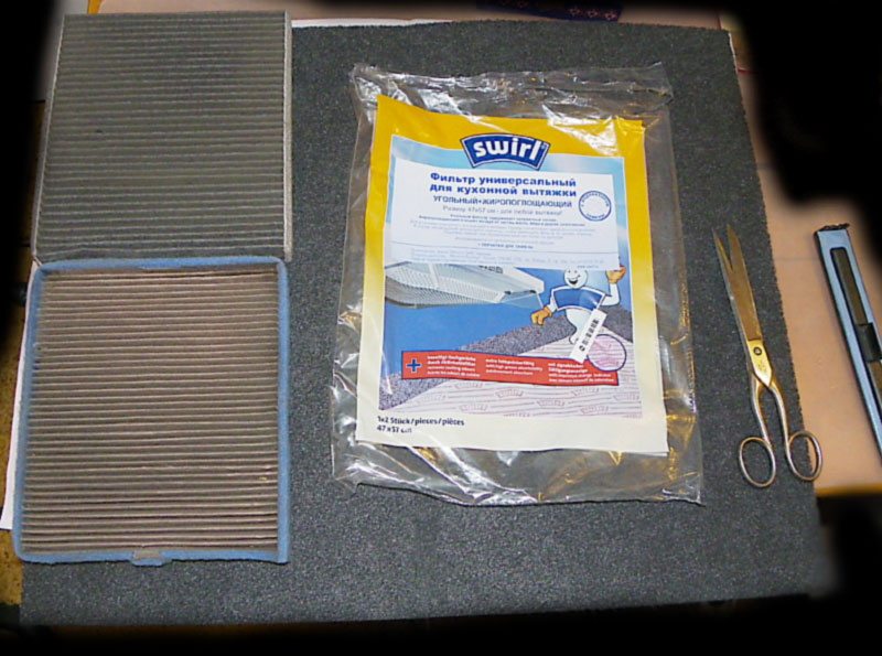 Примеряем родной фильтр на расстеленный угольный и разрезаем последний на три части + полоска в отход. Складываем каждый отрезок в два раза и запихиваем в щель вместо оригинального - работает отлично, камазы не пахнут, особо вонючие могут чуть пахнуть, но не критично!