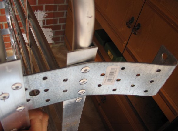 В сроительном брал четыре пластины из оцинковки, загнул концы. К багажнику теми же заклепками. На крыше немного подогнул пластины по месту. Можно крепление из алюминия же сделать, склепать из уголков или уголка с пластиной. Гнуть его под 90 градусов неспортивно. В зависимости от конструкции корзины высота стоек сантиметров 8-10 не больше, чтобы до крыши еще остался запас. Иногда приходится крепить груз лентой и пробрасывать ее под багажником.