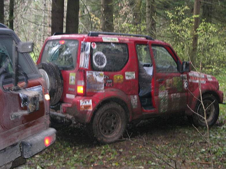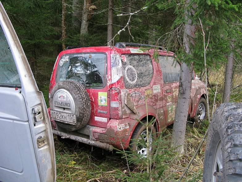 На прохождение трассы длиной пять километров было отведено восемь (!!!) часов. Приколы мы начали ставить уже на первой "засадной" точке С-5. В то время как монстры полезли напролом и сели намертво мы пролезли впритык лесочком. После попытки дернуть Ниссан Террано джимник сходу перелетел под прямым углом четыре колеи и мы первыми взяли эту точку. После чего поехали дальше навстречу орговской машине, пилот которой разматывал лебедку...