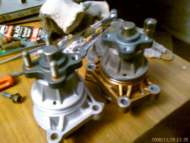 Новая помпа пришла без шпилек :thumbsdown:. Чтобы не повредить резьбу, для скручивания старых шпилек наворачивал на них две законтренные гайки.