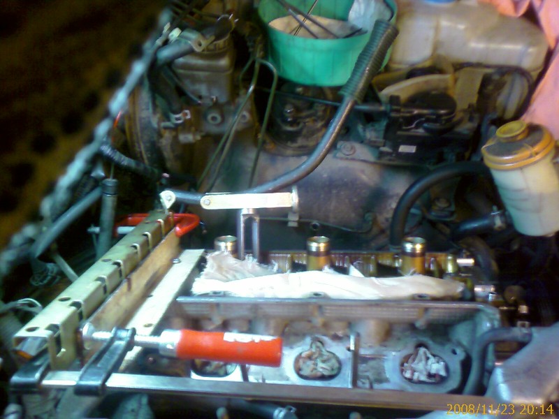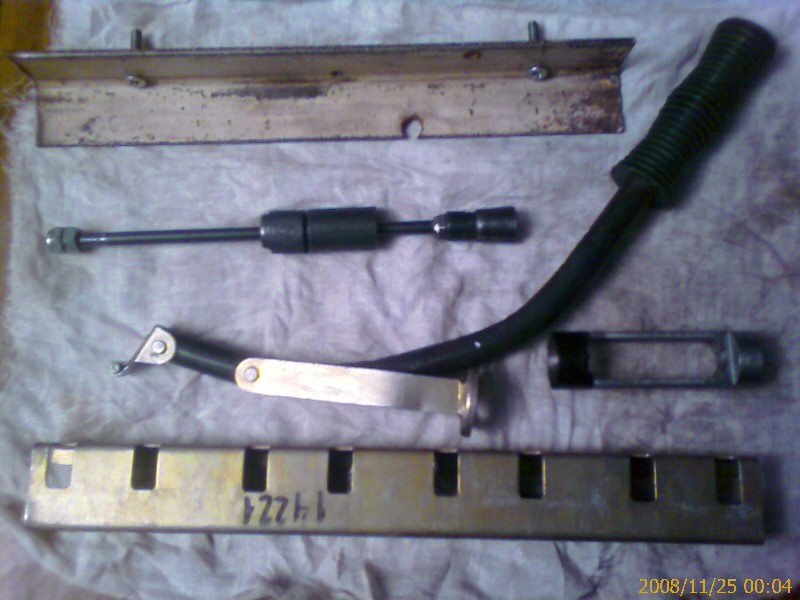 В скобе делаем 2 отверстия, прикручиваем родными болтами к голове, к скобе двумя струбцинами рейку с пазами, в рейку – рычаг, под рычаг – толкатель от Xsen. Давим на рычаг (перед этим не забываем проверить что поршень в ВМТ), вытаскивем сухари. Рычаг пришлось зело загнуть ударами кувалды, иначе он зараза длинный, упирался в детали вокруг двигла. Варианты установки см. картинки внизу.