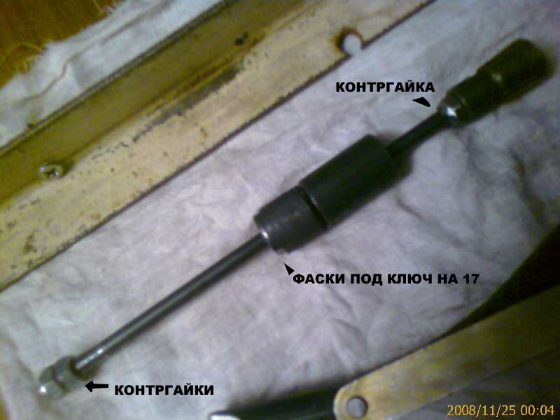 У меня колпачки очень сильно прикипели к сёдлам, снять утконосами нереально. Использовал готовый инструмент за 200руб от 8-ми клапанной 2108/2110. Инструмент полностью подходит по размерам, но говённый – пришлось дорабатывать. То ручка открутится, то насадка. Доработки – вместо ручки насажены две законтренные гайки, под обжимку аналогично закручена гайка выше по штоку и тоже законтрено, сделаны пазы на втулке под ключ на 17.