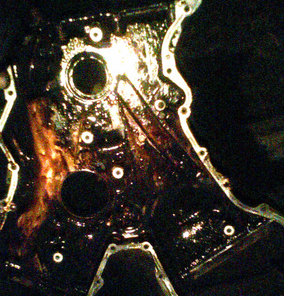 Далее крышка цепей – обязательно иметь удлинённую головку на 10, лучше под квадрат 1/4, и переходник на отвёртку под биты – крутить этих гаек нуно множество, ключом или трещёткой упаришся. Не забываем про 4 болта снизу. Болты крутятся фигово, всё «белые», я их потом проходил плашкой на 6. Крышку цепей снимаем аккуратно – она на герметике. Датчик положения колневала не снимал с крышки. Изоляция проводов датчика в нескольких местах протёрлась – обматываем её всю изолентой. Болт шкива колневала отворачивал фиксируя зубилом маховик (снизу около коробки есть окно).