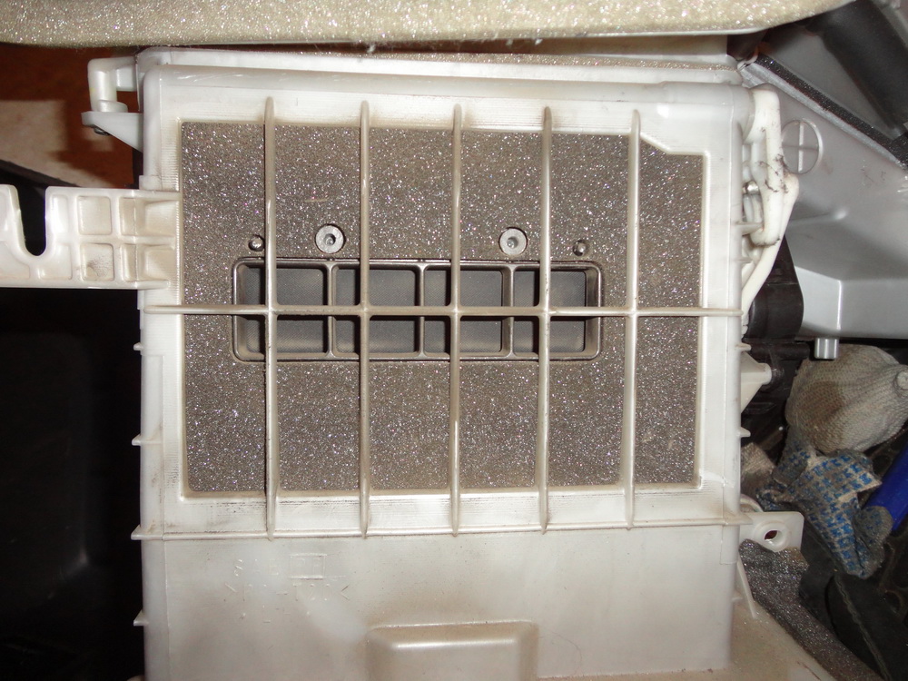 При включении печки на внутреннюю циркуляцию воздуха забор воздуха берется из салона, как вы помните. Это окошко в блоке вентилятора печки смотрит на перегородку между салоном и моторным отсеком. Ранее я думал, что вонь иногда идет из-за того, что забит или сильно запылен поролоновый фильтр, который стоит в этом окошке: