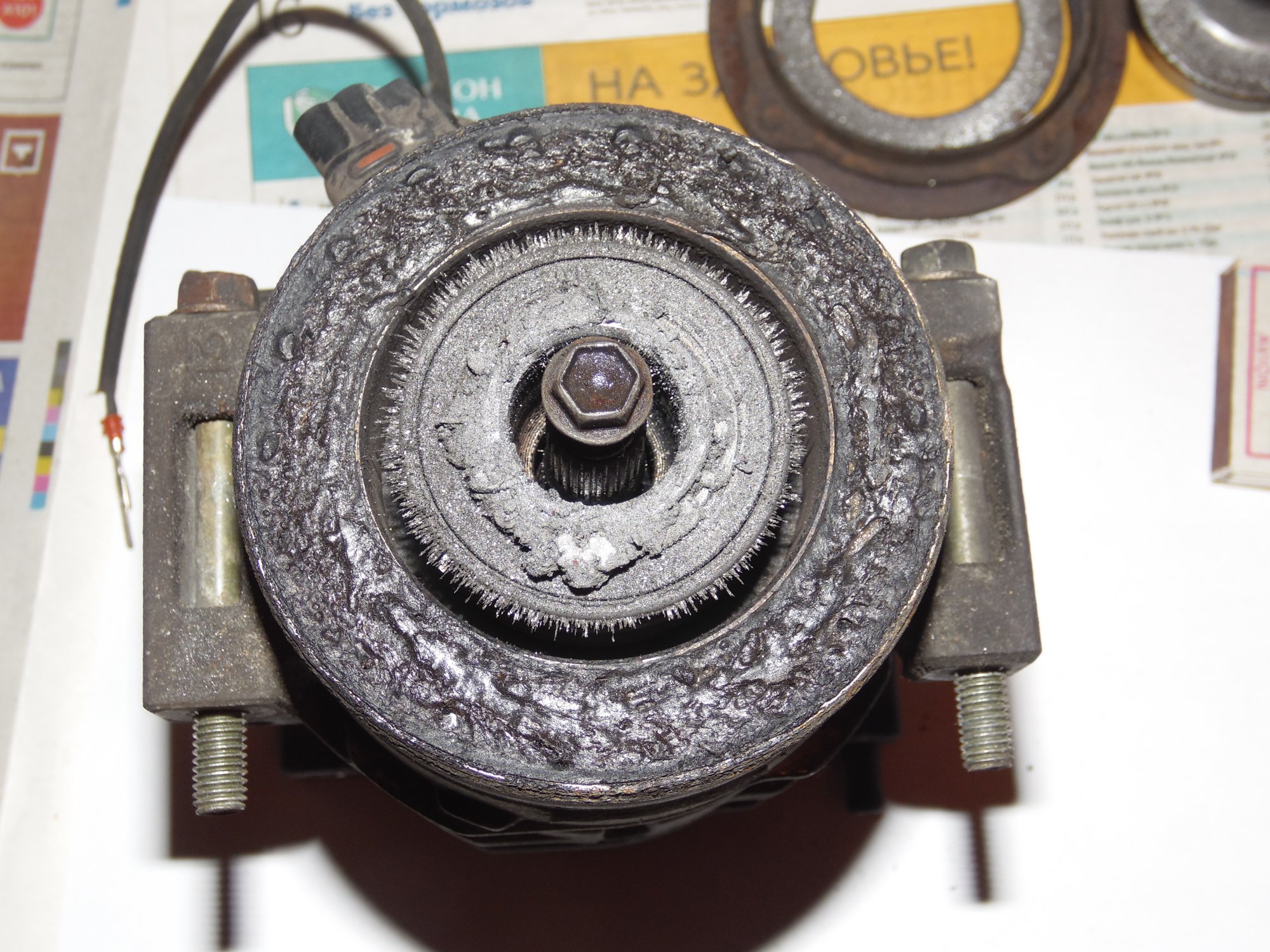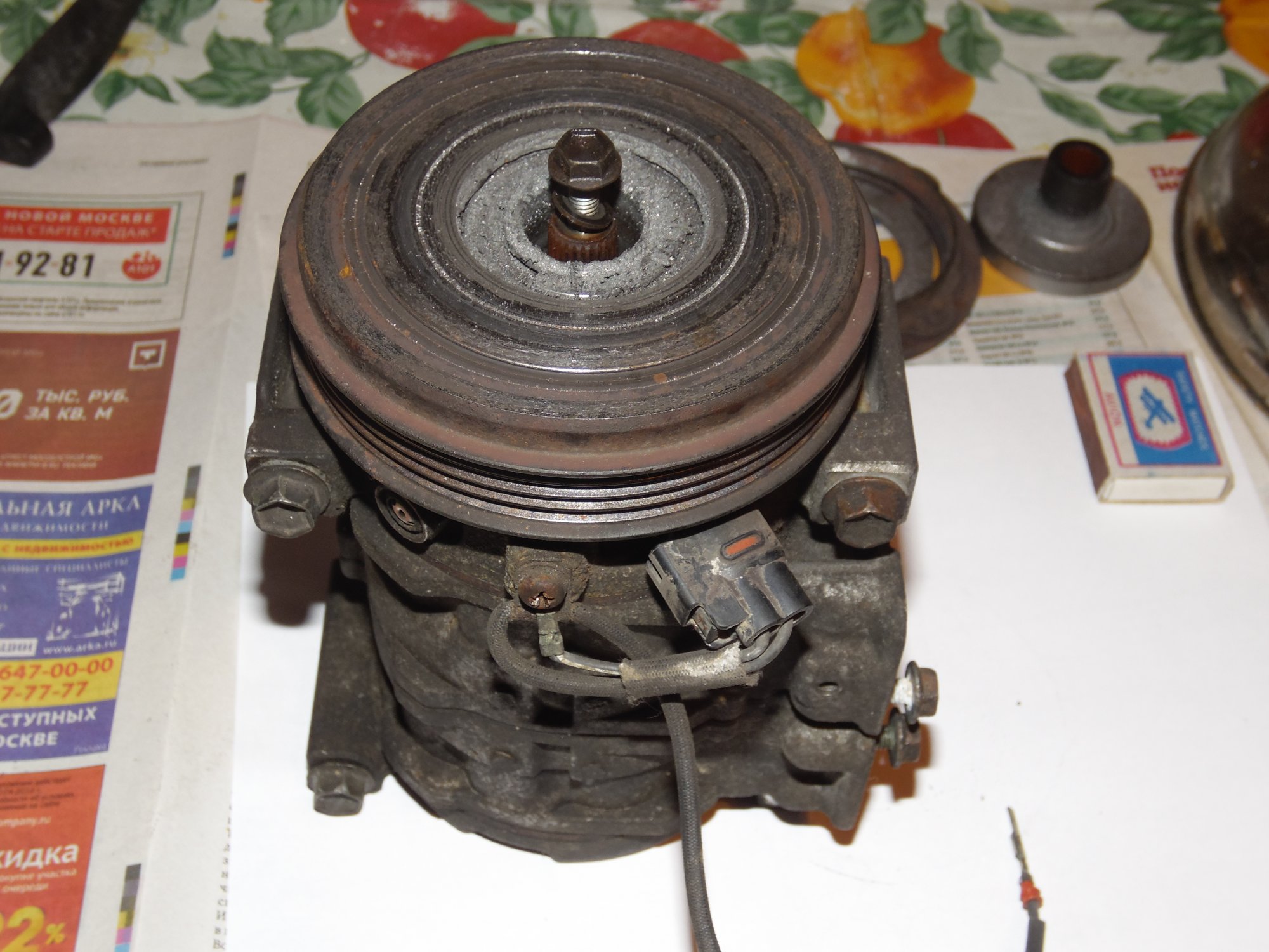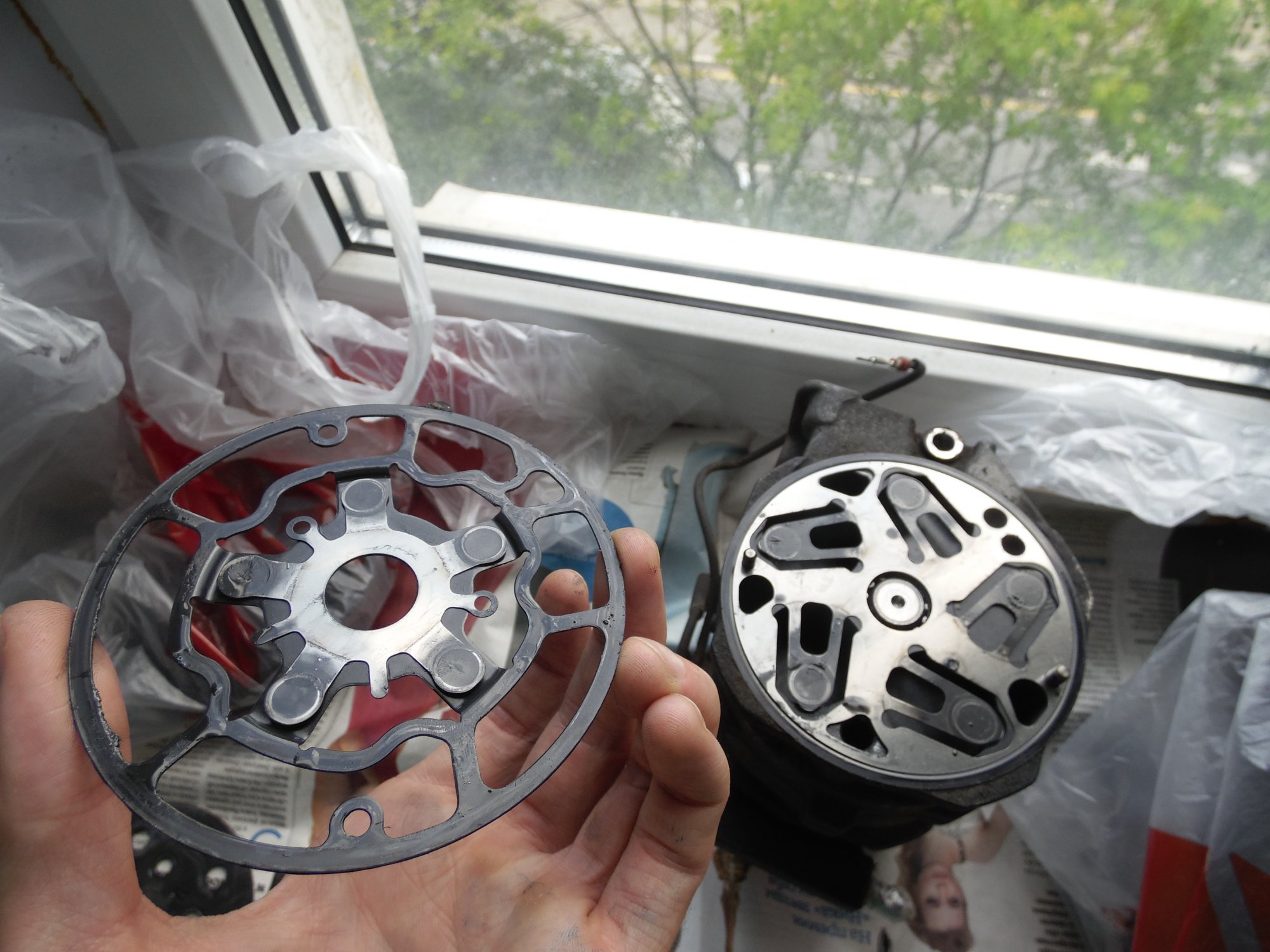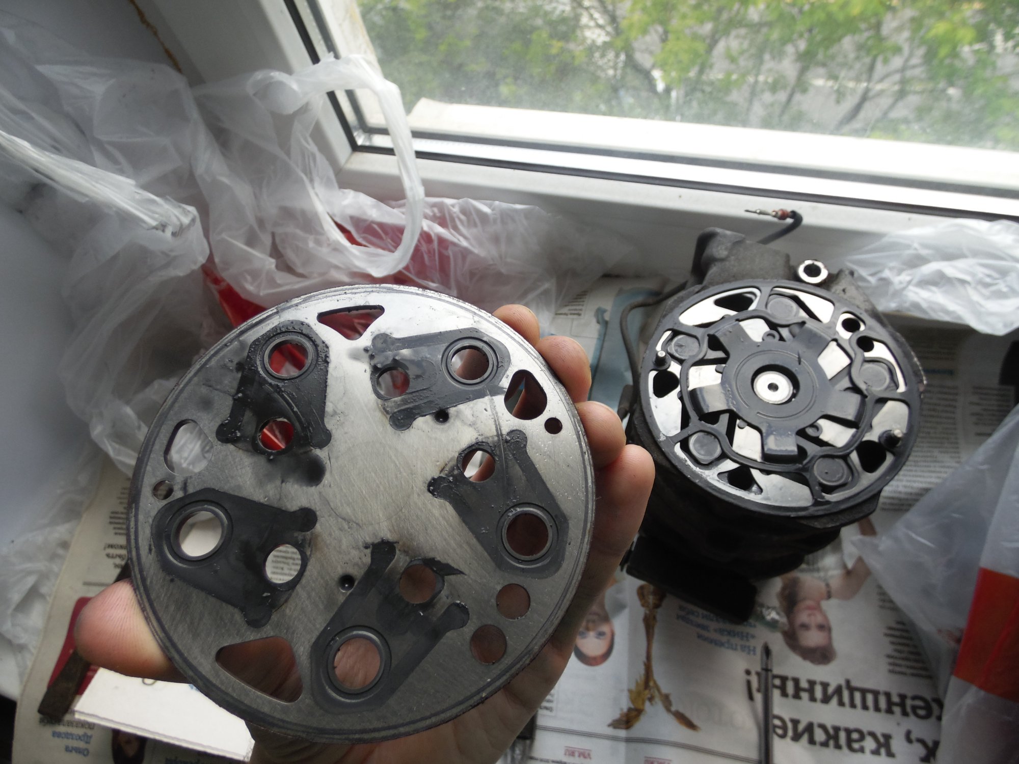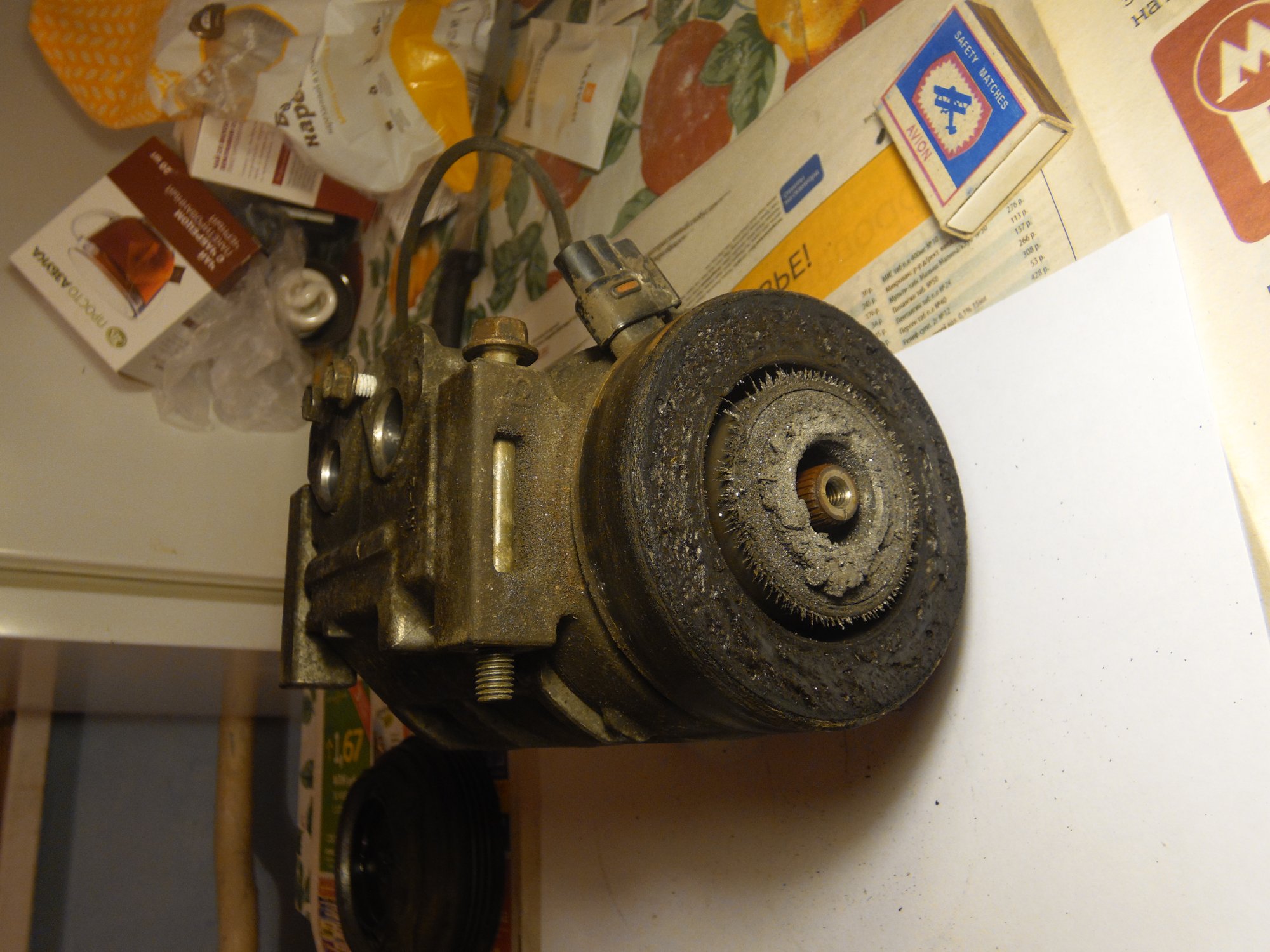 немного фото, возможно по ним можно сделать какой то вывод о чем либо):[DOUBLEPOST=1465604991,1465512884][/DOUBLEPOST]Удалось таки доехать до СТО - по мнению мастера в компрессоре есть выработка - возможно он и клинил , в следствие чего и порвалась резина прижимной пластины а так же виден износ на повернхности шкива которая соприкасается с прижимной пластиной. плюс как видно на фото поверхность электромуфты неровная - видимо плавилась эпоксидная смола, которой залиты витки муфты. по его мнению, на 50% вероятности что в системе имеется стружка от выработки компрессора, по сему еще и всю системку надо промывать и менять осушитель и конденсор .. в общем починка сего узла как четвертая часть стоимости машины обойдется =) как думаете прав-неправ?