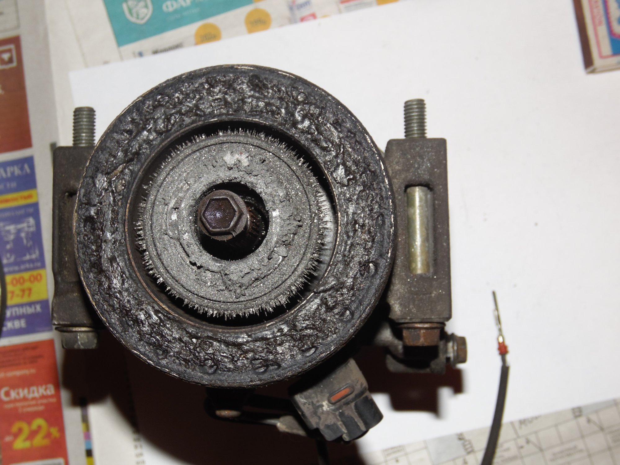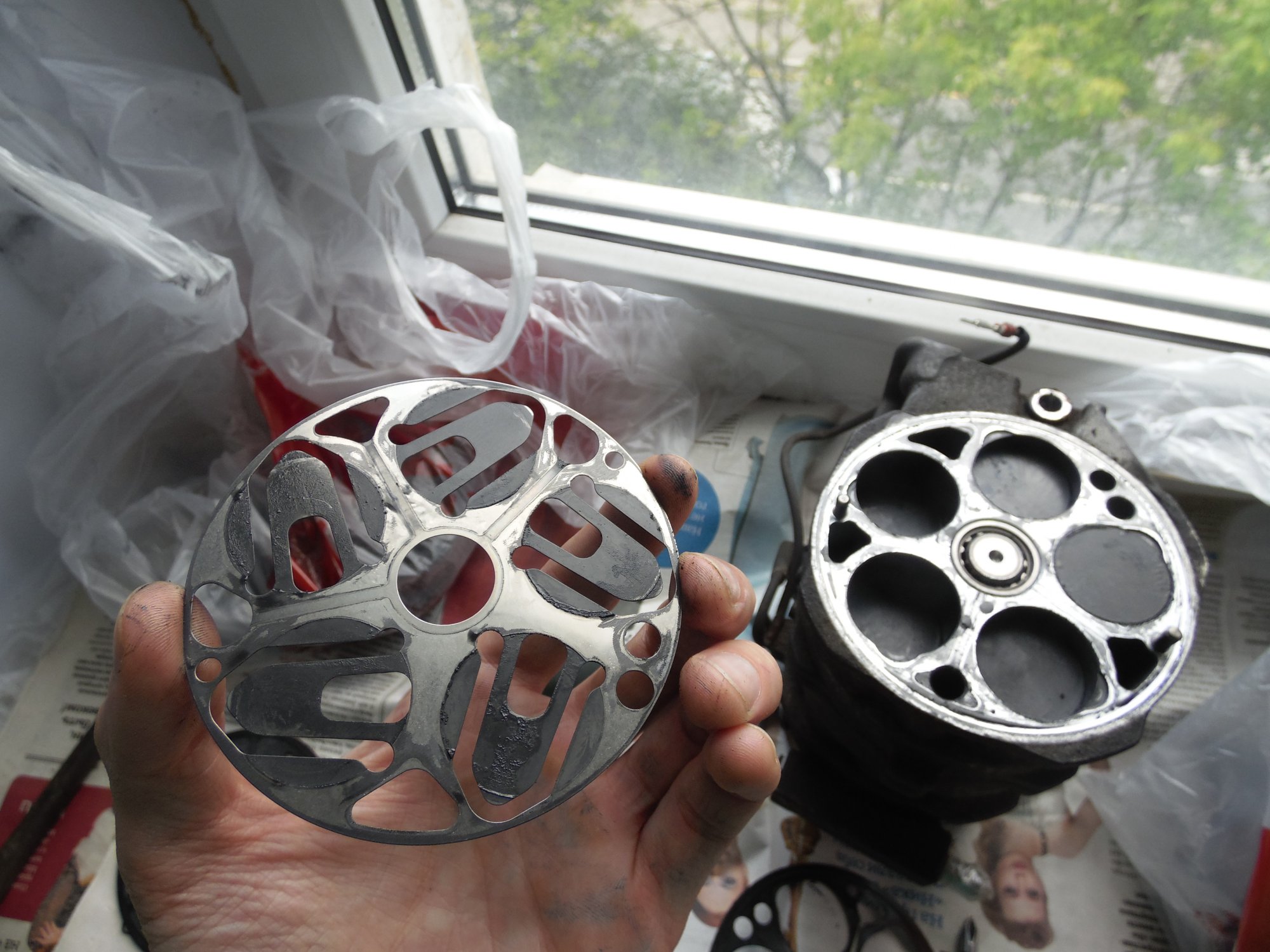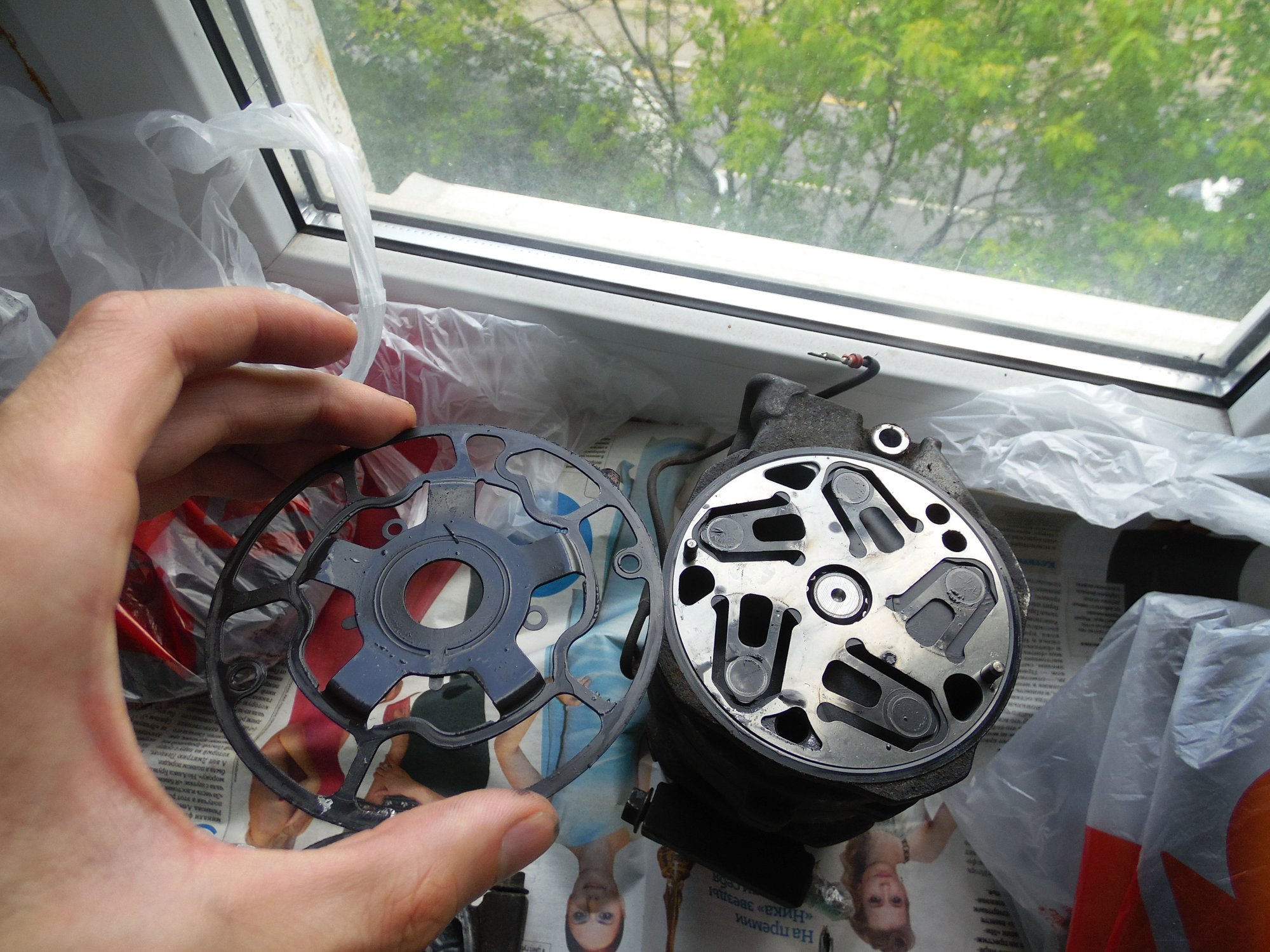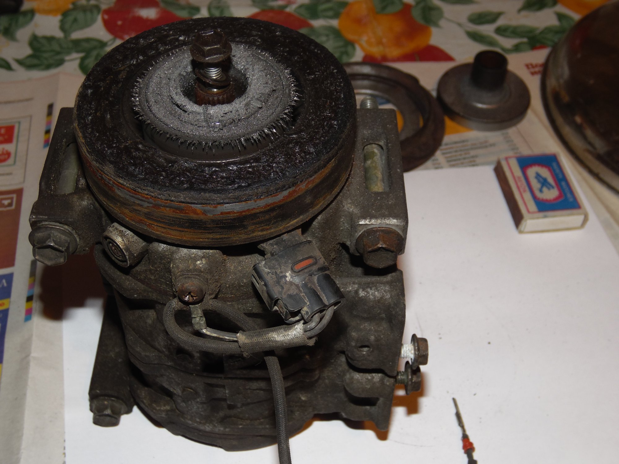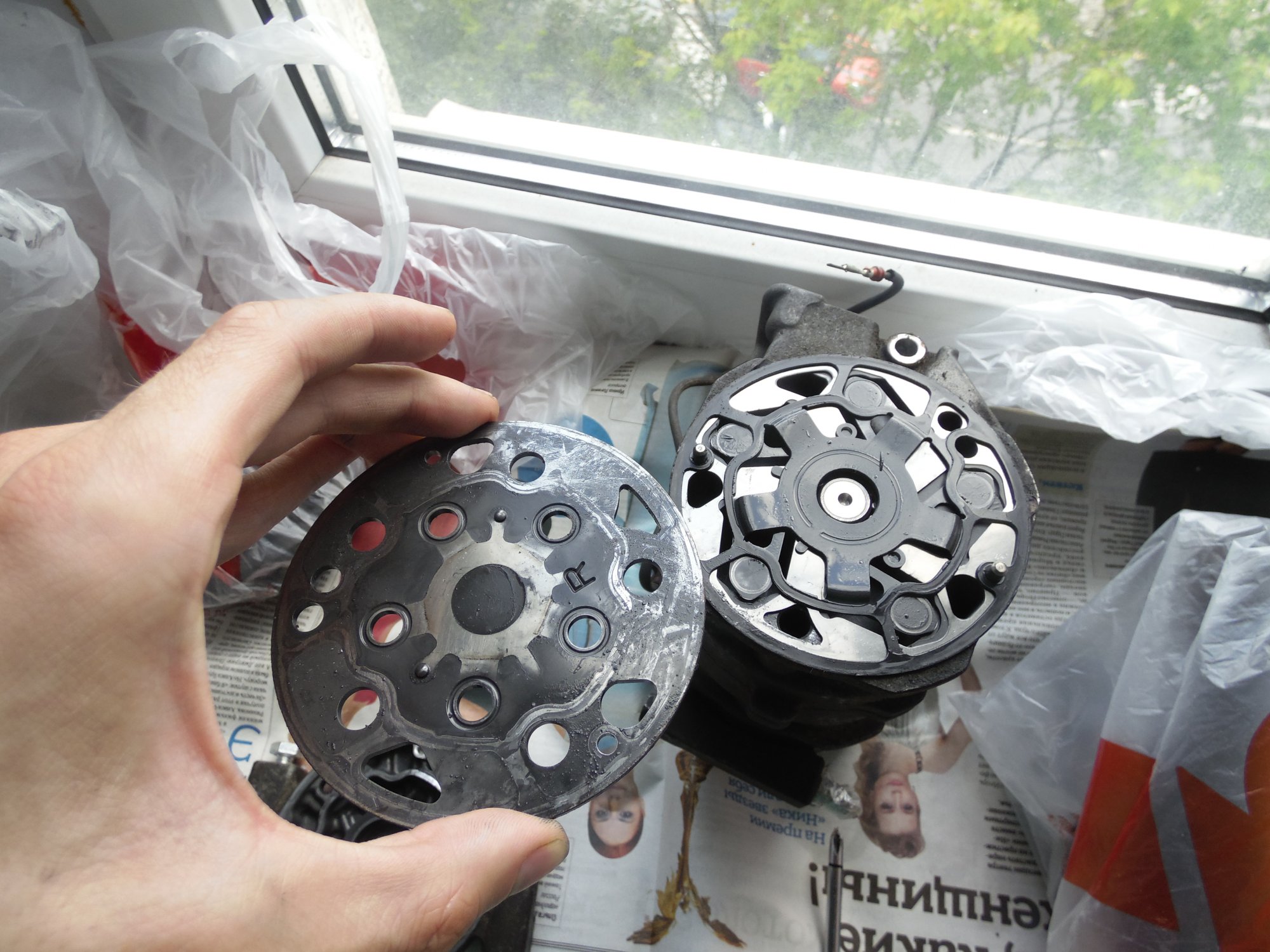 немного фото, возможно по ним можно сделать какой то вывод о чем либо):[DOUBLEPOST=1465604991,1465512884][/DOUBLEPOST]Удалось таки доехать до СТО - по мнению мастера в компрессоре есть выработка - возможно он и клинил , в следствие чего и порвалась резина прижимной пластины а так же виден износ на повернхности шкива которая соприкасается с прижимной пластиной. плюс как видно на фото поверхность электромуфты неровная - видимо плавилась эпоксидная смола, которой залиты витки муфты. по его мнению, на 50% вероятности что в системе имеется стружка от выработки компрессора, по сему еще и всю системку надо промывать и менять осушитель и конденсор .. в общем починка сего узла как четвертая часть стоимости машины обойдется =) как думаете прав-неправ?