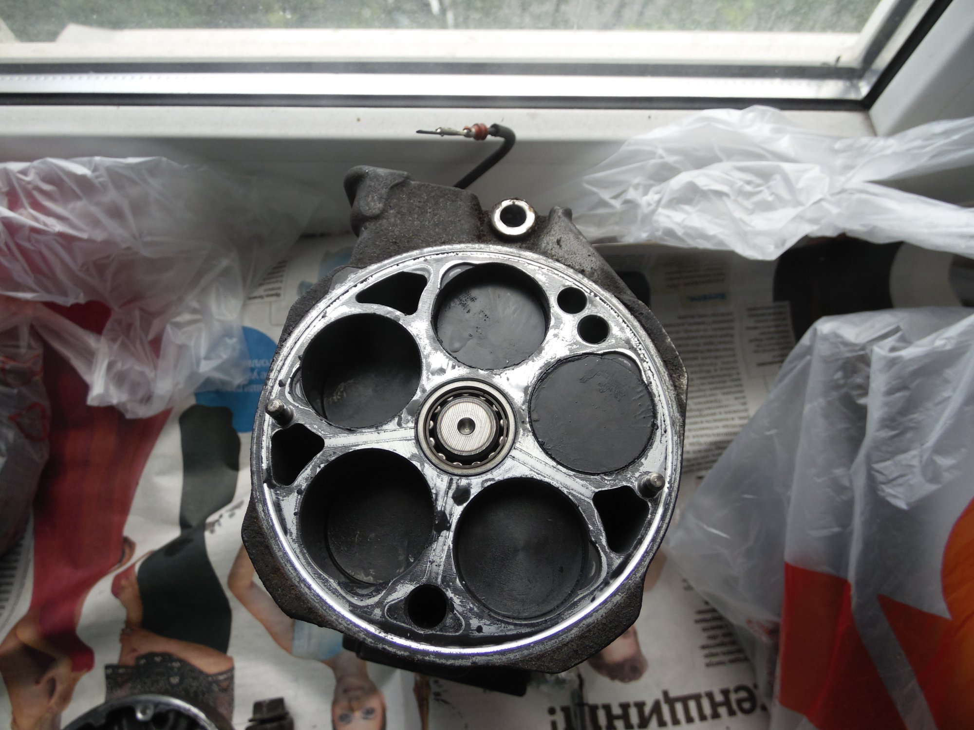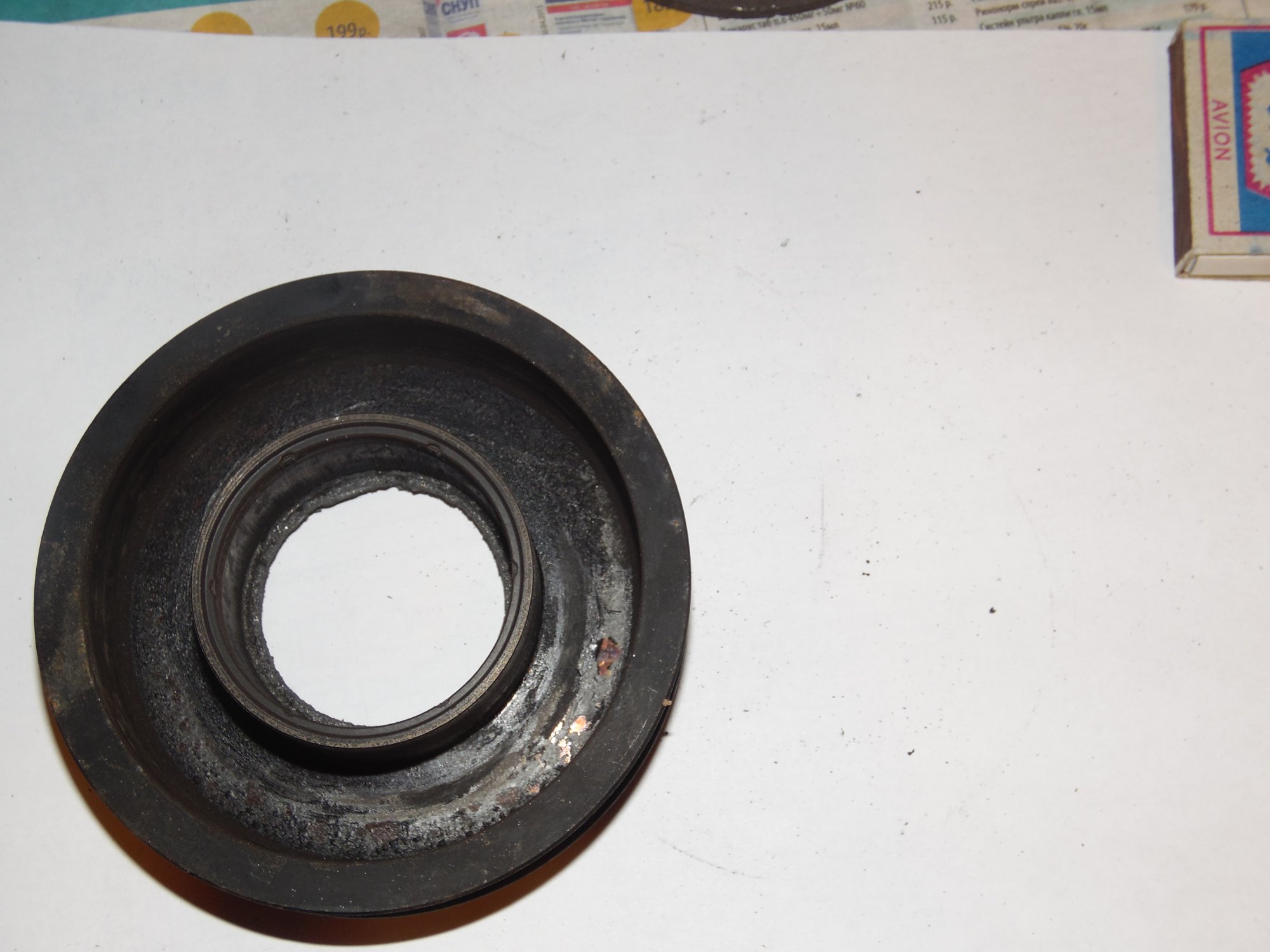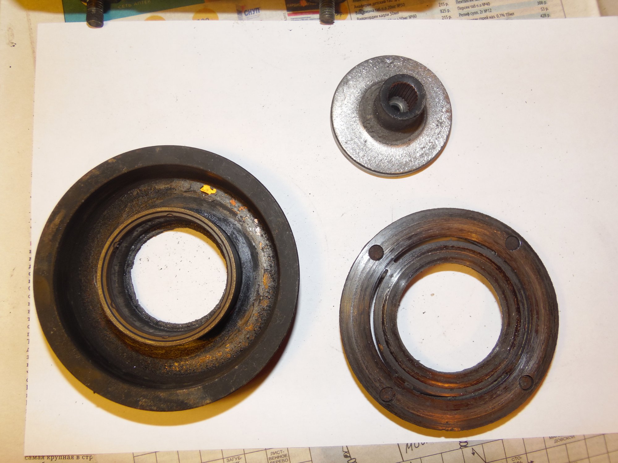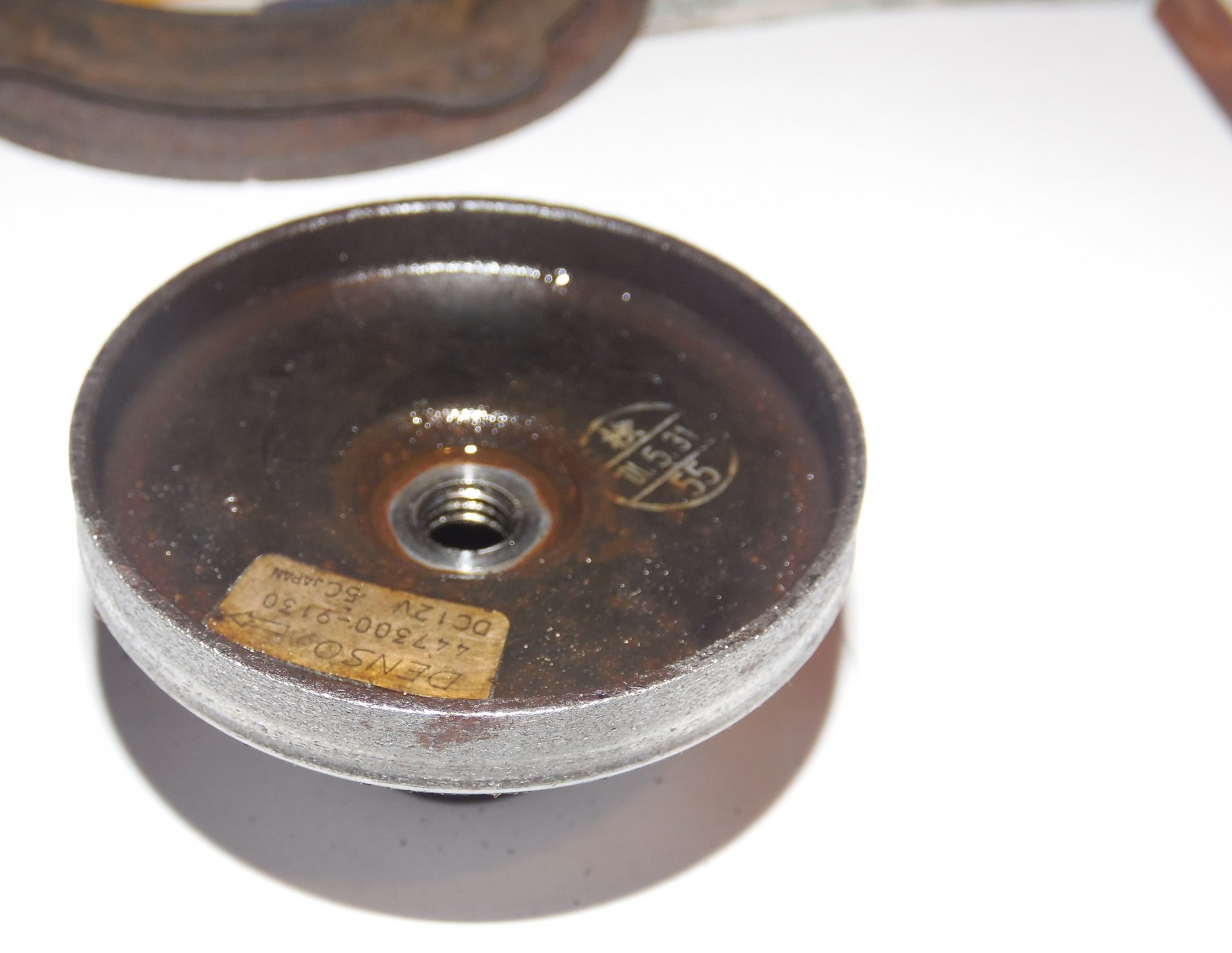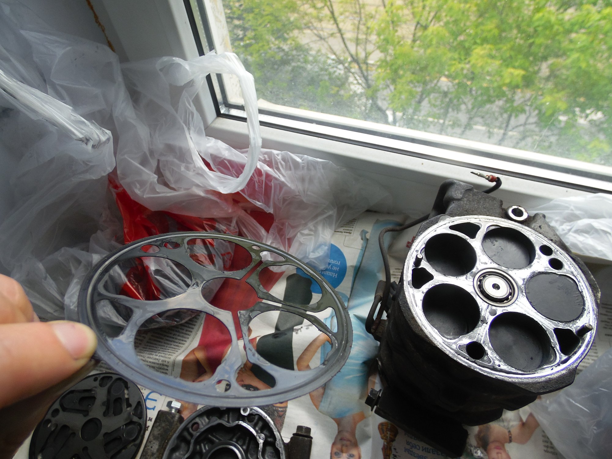 немного фото, возможно по ним можно сделать какой то вывод о чем либо):[DOUBLEPOST=1465604991,1465512884][/DOUBLEPOST]Удалось таки доехать до СТО - по мнению мастера в компрессоре есть выработка - возможно он и клинил , в следствие чего и порвалась резина прижимной пластины а так же виден износ на повернхности шкива которая соприкасается с прижимной пластиной. плюс как видно на фото поверхность электромуфты неровная - видимо плавилась эпоксидная смола, которой залиты витки муфты. по его мнению, на 50% вероятности что в системе имеется стружка от выработки компрессора, по сему еще и всю системку надо промывать и менять осушитель и конденсор .. в общем починка сего узла как четвертая часть стоимости машины обойдется =) как думаете прав-неправ?