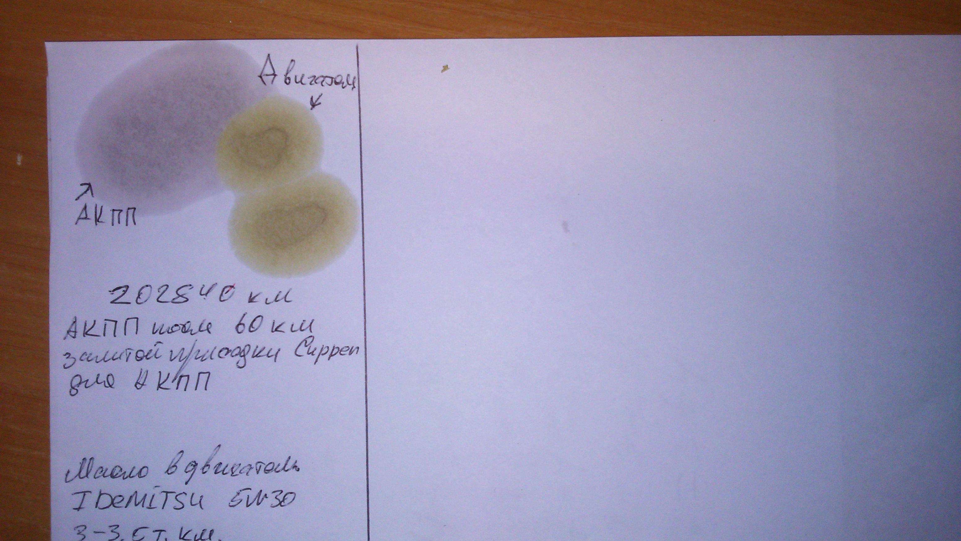 Вот проба масла через 60 км. после заливки энергетика Cupper для АКПП, оно тёмное, но при этом прозрачное, без явных вкраплений, горелым не пахнет. К сожалению не догадался сделать капельный тест ДО заливки присадки. :(