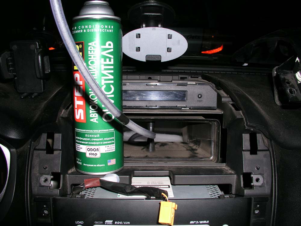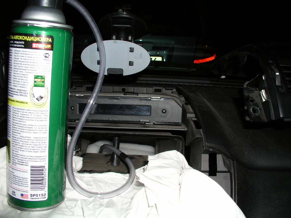 Исходя из конструкции воздуховодов НСГВ, перед обеззараживанием испарителя кондиционера, нужно правильно сориентировать створки направления потока воздуха (судя по всему - в лицо водителя, что-бы пена из воздуховода над магнитолой попала на испаритель).