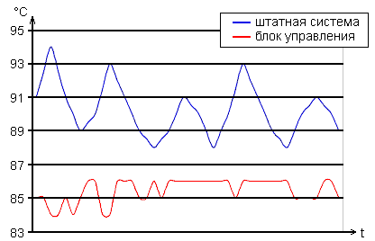 На этом графике видно, что колебания температуры ОЖ при работе штатной системы составляют 5°С, что равно гистерезису, заложенному в датчике включения вентилятора (температура включения 92°С, выключения - 87°С). При использовании же блока управления вентилятором с адаптивным алгоритмом, температура колеблется в пределах 1°С, т.е. погрешности измерения. При этом колебания температуры в данном случае имеют больший период, что тоже в общем случае лучше для ДВС.