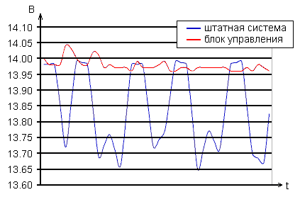 Измерения проводились на одной и той же машине в одинаковых условиях (сначала серия измерений с блоком управления, затем идентичная серия со штатной системой) стандартным тестером с термопарой. Точность измерения температуры - 1°С, напряжения - 0.01В. Интервал между отдельными измерениями в каждой серии составлял 15 секунд. Температура измерялась в непосредственной близости от датчика температуры, на корпусе термостата. Напряжение измерялось непосредственно на плюсовой клемме АКБ.