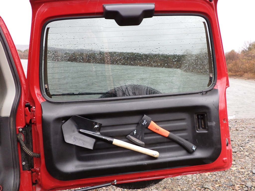 Для удобства и оперативности съёма её на соревнованиях,я к винту,который стягивает половинки хомута приварил гайку(типа барашка).Одел на винт шайбу,в которой просверлил отверстие в 1.5мм и накрутил гайку с пластиковым оботком(против самооткручивания).Шайба должна крутится.В неё продел миллиметровый тросик,стянул медной трубкой,второй конец на багажнике.Теперь не надо боятся,что в спешке потеряешь винт-открутил,бросил,снял лопату,поставил обратно,нащупал винт с тросиком и притянул обратно.Да,ещё маленький нюанс,на медную трубку надел термическую трубочку для электрики и обтянул зажигалкой..-чтоб пальчики не поцарапать..