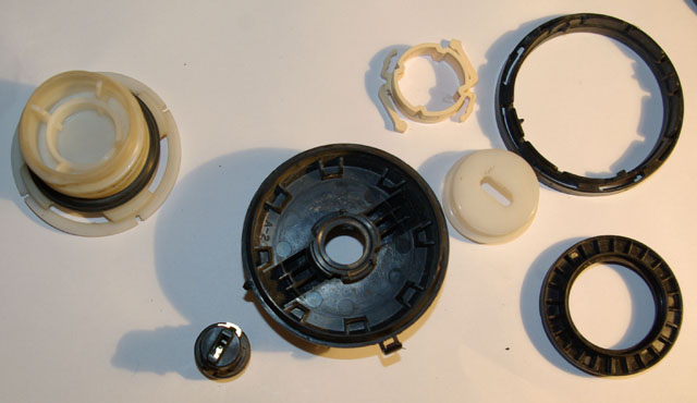 Разбираем замок, повернув против часовой стрелки верхнее стопорное кольцо(на фото снизу справа)