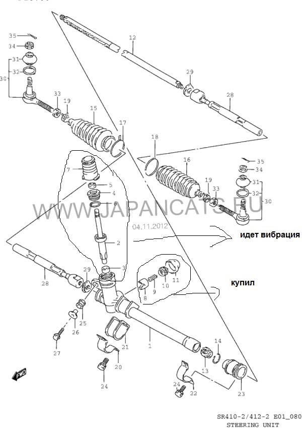 Недавно "Заиграла" рулевая рейка, при том очень странно на скорости свыше 80 км/ч идет вибрация из узла указанного на рисунке, наконечники и тяги заменил весной, в них проблем нет. Купил указанный на рисунке рем. комплект. но не устанавливал. Втулка под номером 14 в отличном состоянии.