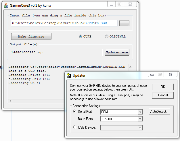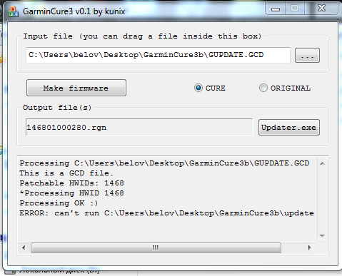 Дело в том, что GarminCure3 у меня запускается. И без администратора. И устройство определяется без ошибок, а вот updater.exe не идет.