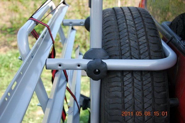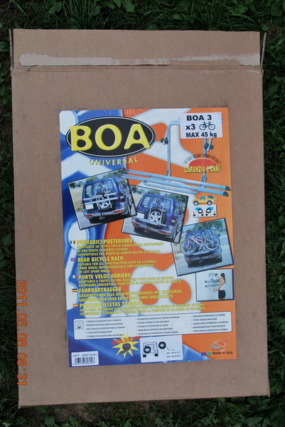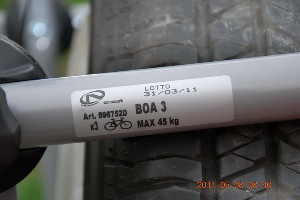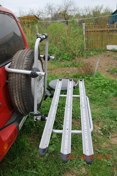 , мы выдвинулись на дачу. Сборка не требует познаний хотя бы основ квантовой механики и мы принялись за сборку. Первое, что пришлось сделать, это распрощаться с хромированным колпаком для запаски. Возить велосипеды теперь я буду на запасном колесе и в отличие от несильного изобилия таких девайсов на рынке, купленный мною имеет основу, на которую, аж ТРИ!!! велосипеда будут не подвешены, а установлены. По инструкции, девайс без проблем одевался на мою запаску, но хотя и мой размер колёс и был указан на коробке, но без вмешательства в конструкцию не обошлось. Взяв дрель в руки и разметив расстояние, мы проделали пару навых отверстий. После данной процедуры, багажник встал как влитой. Укретив конструкцию стяжными ремнями и установив направляющие для велосипела, мы удовлетворённо вздохнули - получилось здорово. Велосипедов, случайно у нас неоказалось, всё получилось экспромтом. Но от дачи, мы честно ехали с багажником, дабы проверить его закреплённость, издаваемый свист и привыкания к новым габаритам. Вся дорога, а это около 170 км, прошла без сучка и задоринки. Немного, совсем немного выступают направляющие для установки велосипедов а какого либо дополнительного свиста, итак издаваемого антеной на крыше я не услышал. Но мы, повторяюсь, ехали без велосиледов. До дома, натяжки ремней не ослабли и девайс сидел крепко. Лошка дёгтя: в трубу, которая одевается за колесо, нужно будет внести конструктивное изменение - изонтуть немного или сделать выборку, т.к. щётка заднего стекла за неё цепляется. Но это уже другая история. В целом, я доволен, чего и Вам желаю.