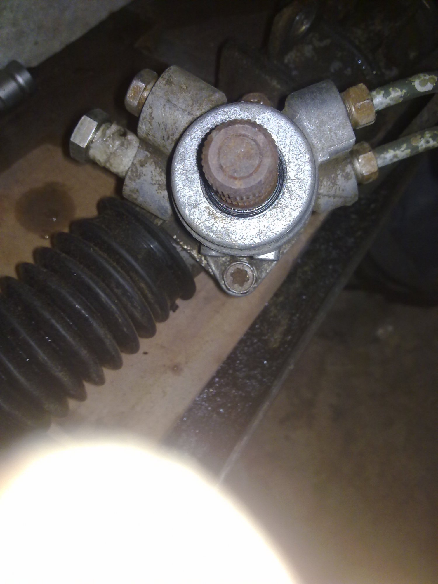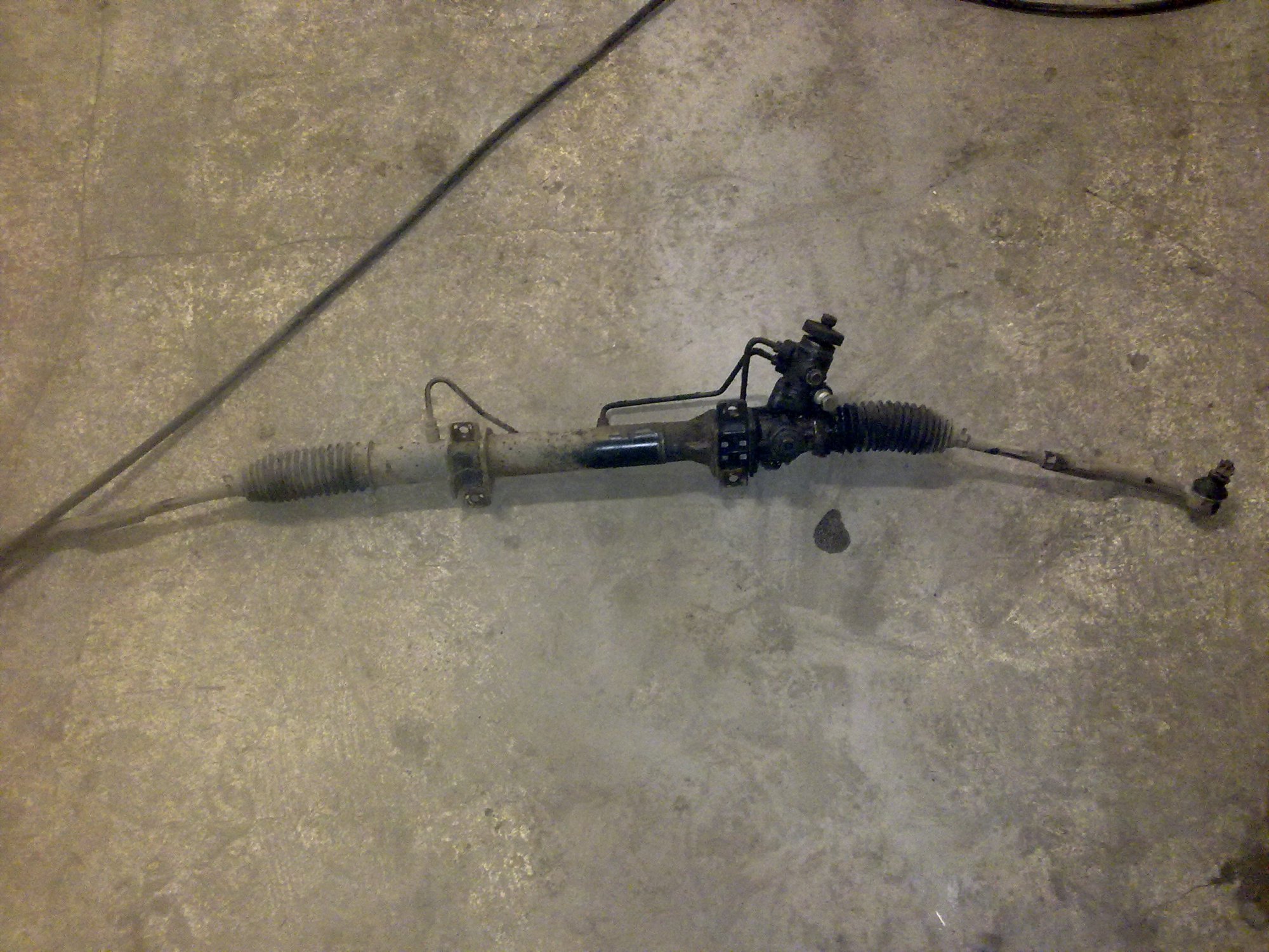 После этого можно снимать рейку, четыре болта на 14, которые крепят рейку к поперечной балке, два рулевых наконечника, приспускаем рейку вниз и откручиваем два шланга, сначала нижний, приготовьте литровую тару, чтобы старая жижа не пролилась на пол., потом верхний, так-же вытечет немного жижи, сольется примерно всего с поллитра.