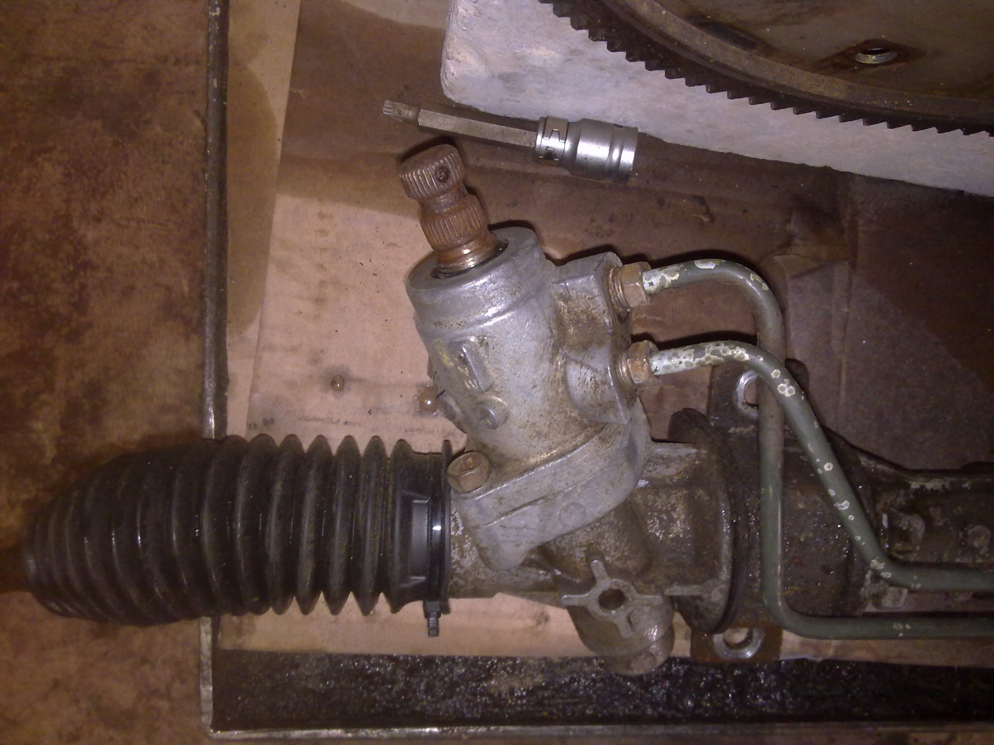 Для удобства попадать нижний конец рулевого корданчика, снимаем его с верху, ведь мы выше уже открутили болт. Прикрутив рейку на место , всталяем карданчик, затягиваем нижний болт рулевого карданчика, после этого попадаем верхний конец, так намного удобнее и затягиваем. Естественно смотрим на положение заблокированого руля и колес.