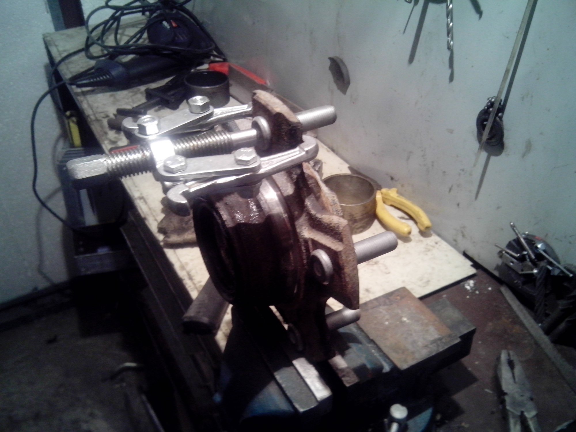 далее, в тисках( для удобства) маленьким двухлапым съемником,предварительно побрызгав ВД-шкой, выпрессовываем родные шпильки,вместе с моховиком,я так понял, АБСа все выходит легко!