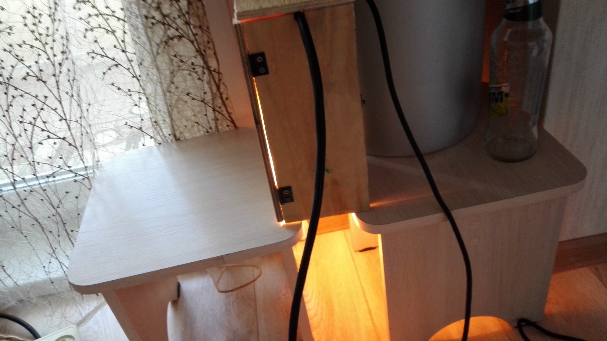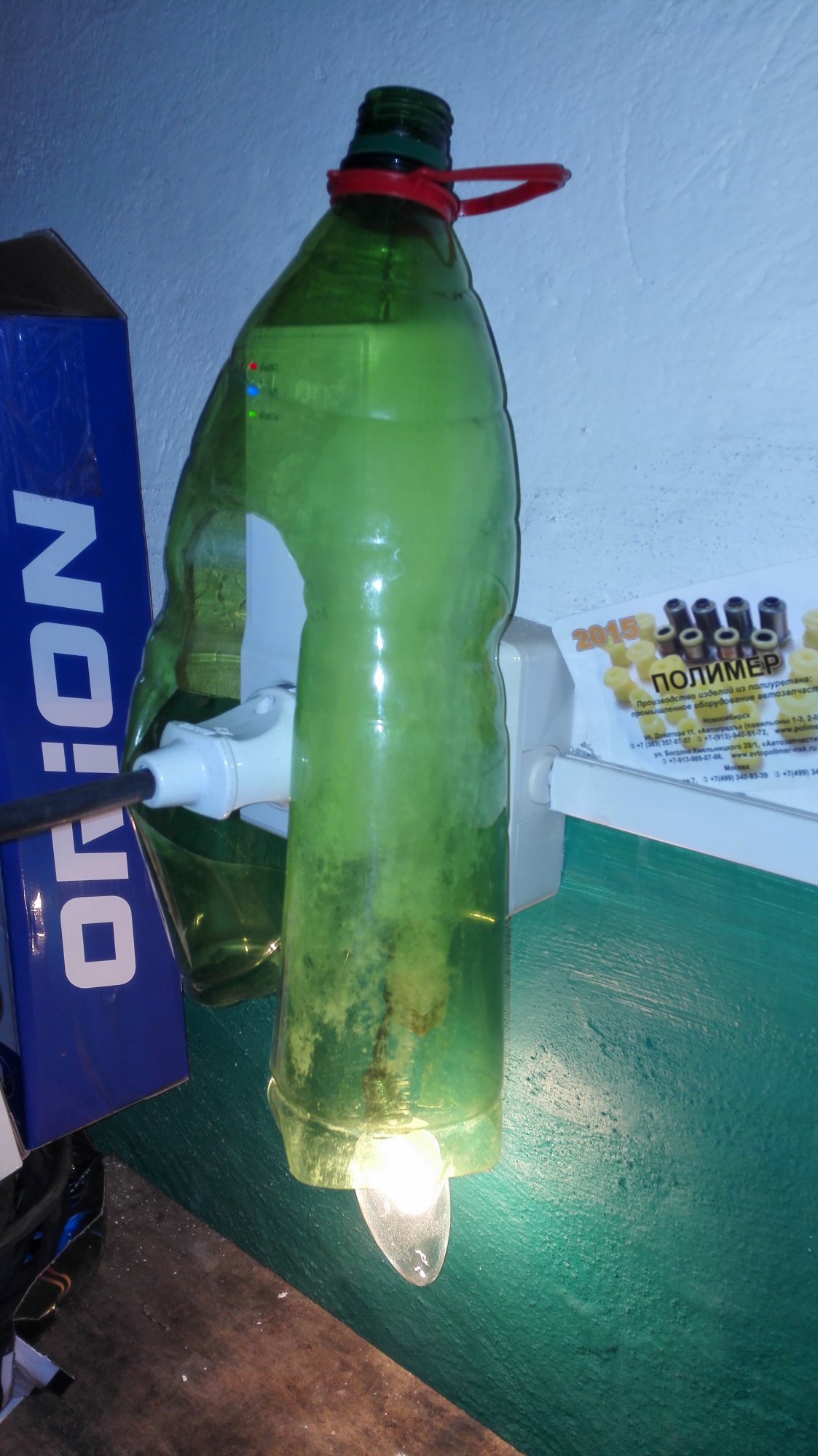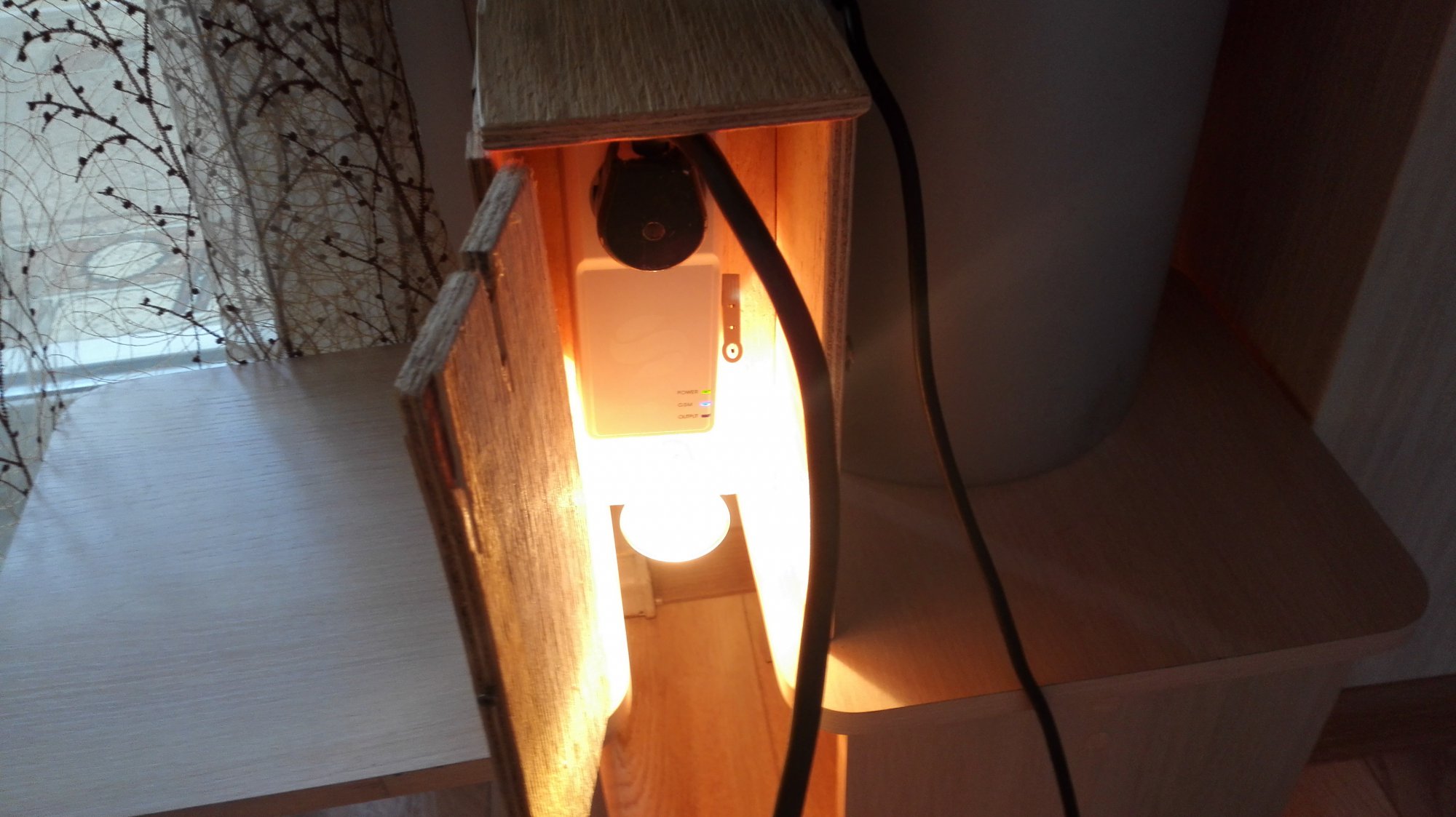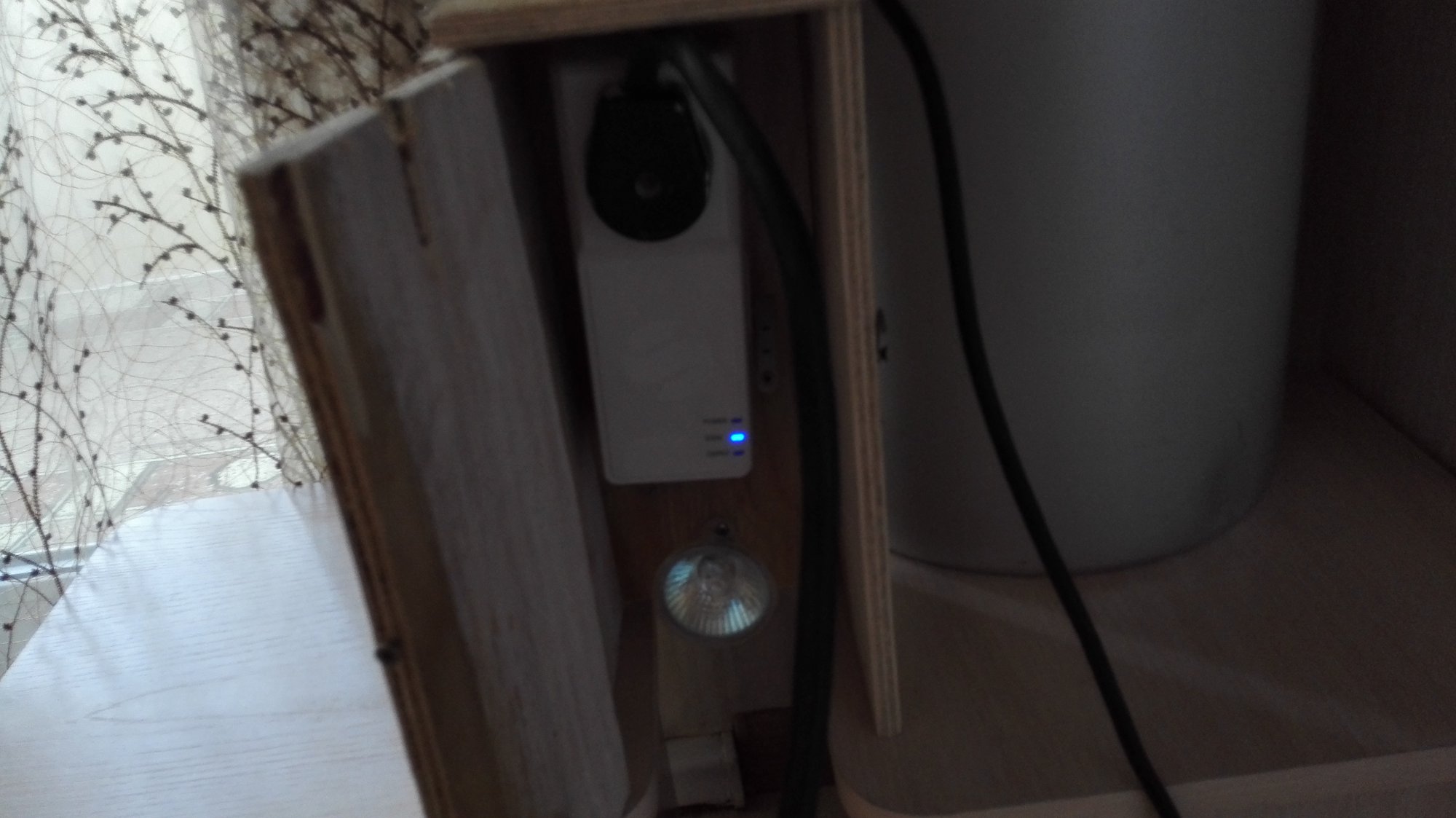 Привет всем, кому интересны мои тексты, так как в гараже температура приблизилась к критической ((для умной розетки, по паспорту -10*, ниже может уже и не работать)) а морозов то еще не было, решил не рисковать, цена выросла почти вдвое на нее-против той как покупал, сделать что то вроде инкубатора, чтоб в самый нужный момент не подвела, на скорую руку из пластиковой бутылки и лампочки от старого холодильника была сооружена конструкция для проверки устройства, (ФОТО) тестировалась несколько дней, при температуре -8* в гараже температурный датчик выдавал +1* или 0* градусов, основную сделал из фанеры 10 мм, после изготовления при проверке=дома 24* повысилась в течении часа до 45*, пришлось верхнюю крышку сделать поворотной, для регулировки температуры, при открытии оной, стала понижаться до 35*, кажется получилось то что хотел, температуру подогрева можно регулировать в зависимости от морозов.