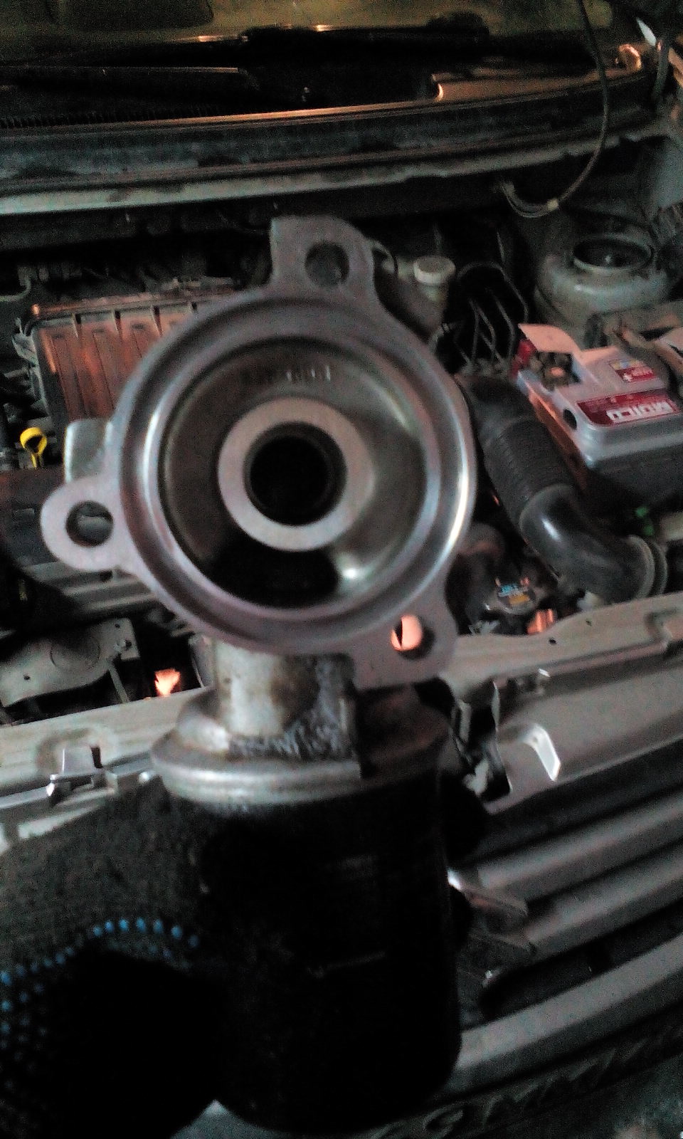 И так ждем когда остынет коллектор, начинаем откручивать болты их там три верхний и правый без проблем, левый нижний не удобно из-за трубки слева от коллектора, но главное не терять веры в победу… Откручивание проблем не доставило. Масляный фильтр снимать не пришлось, он не мешает, масло утечет не много так что когда поледний ослабите оно побежит.