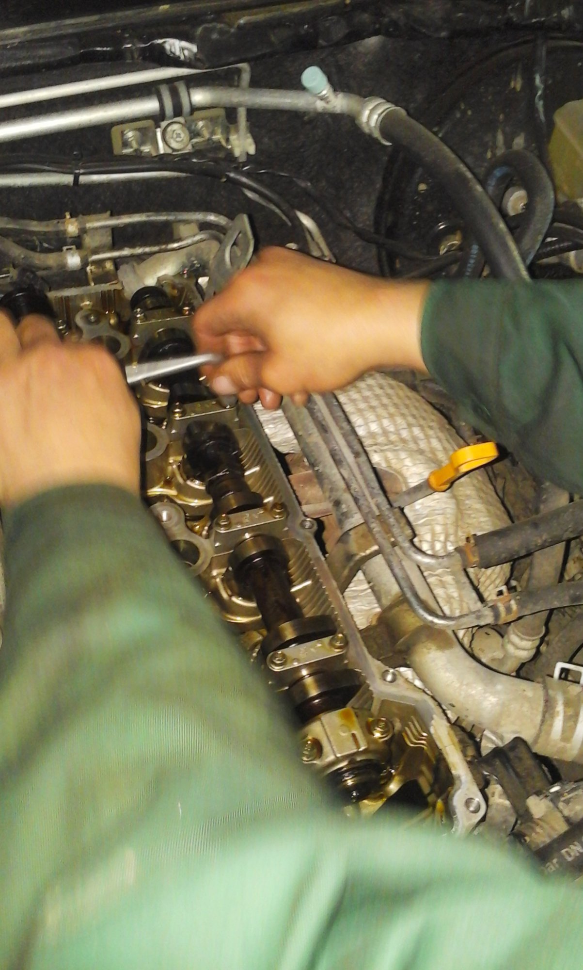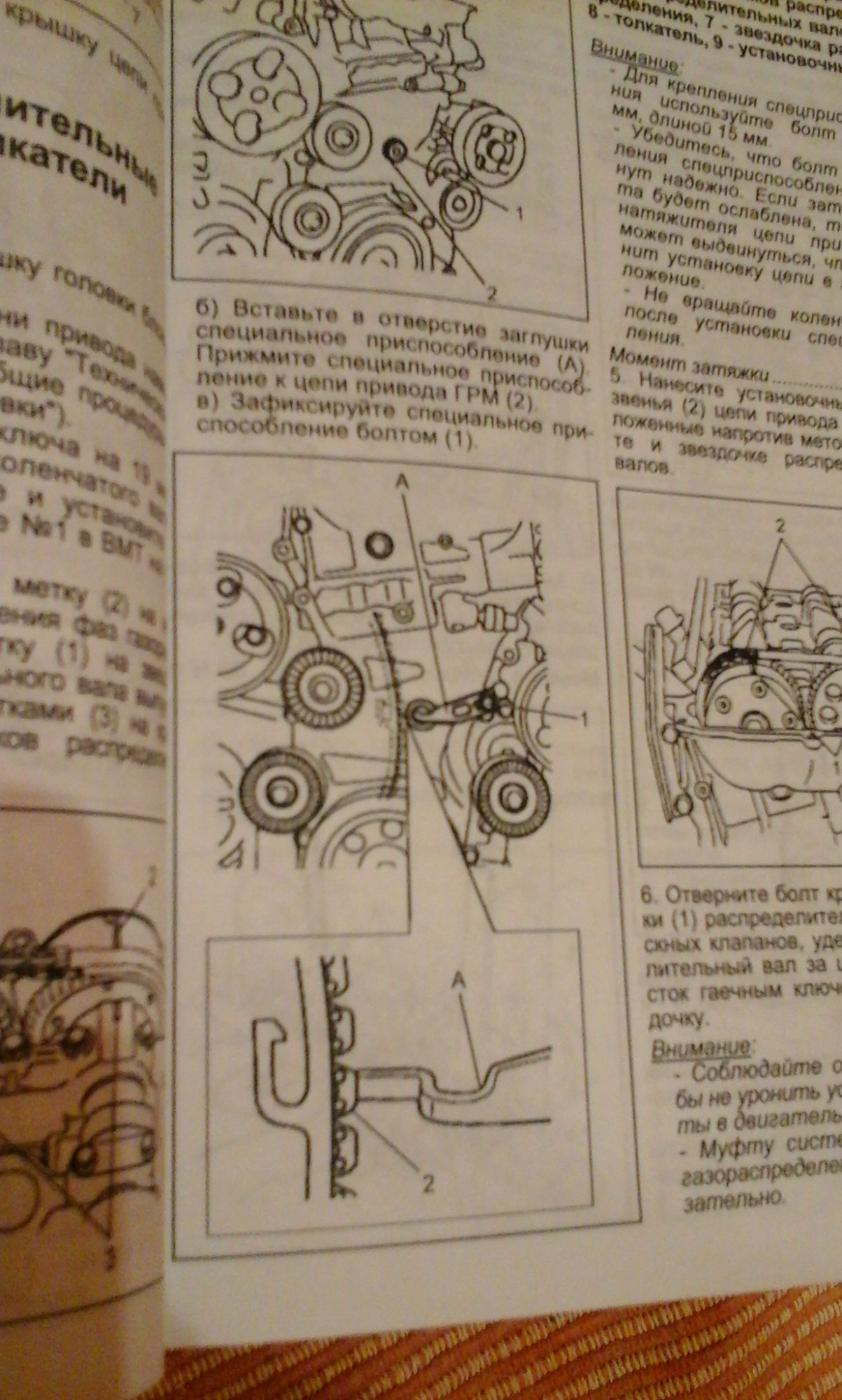 Берём ключ на 19 и по часовой стрелке крутим болт шкива коленвала таким образом, чтобы метка на шкиву коленвала, метка звездочки выпувскного распредвала и метка на муфте впуского распредвала совпадали с метками на движке. Заменяем тепловой зазор в 1 и 2 цилиндре на впуске и 1 и 3 на выпуске.Записываем показания.