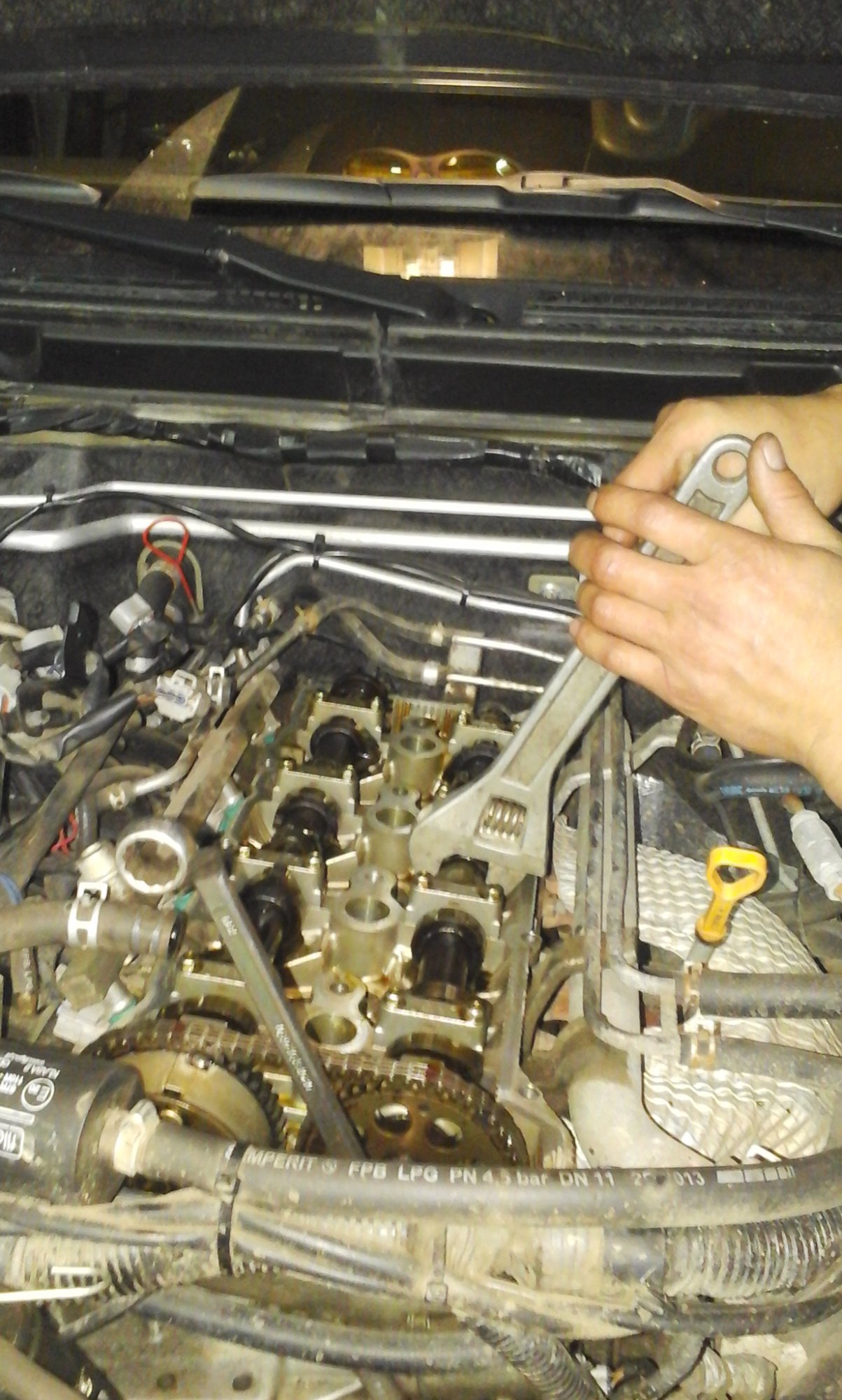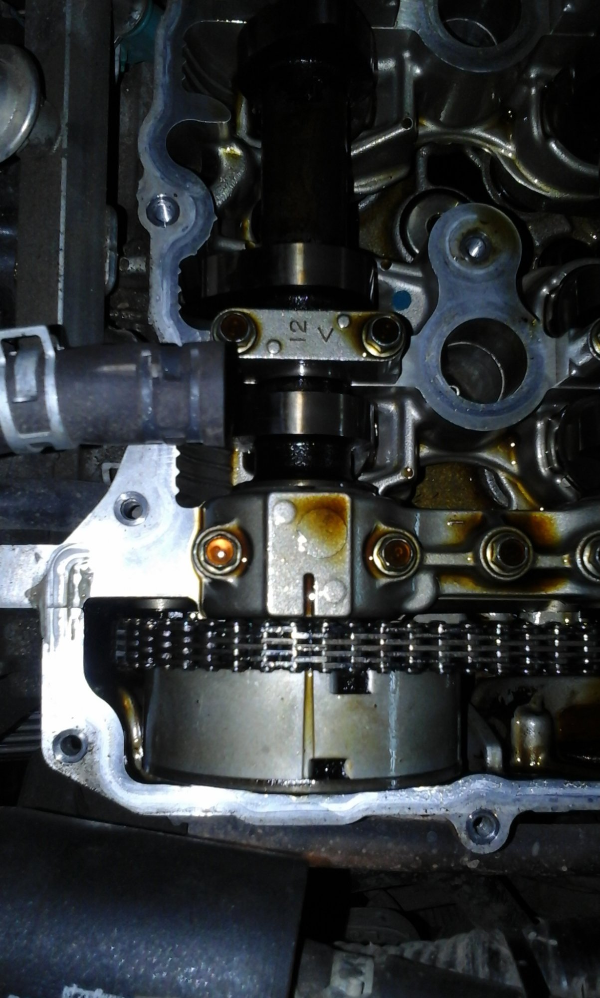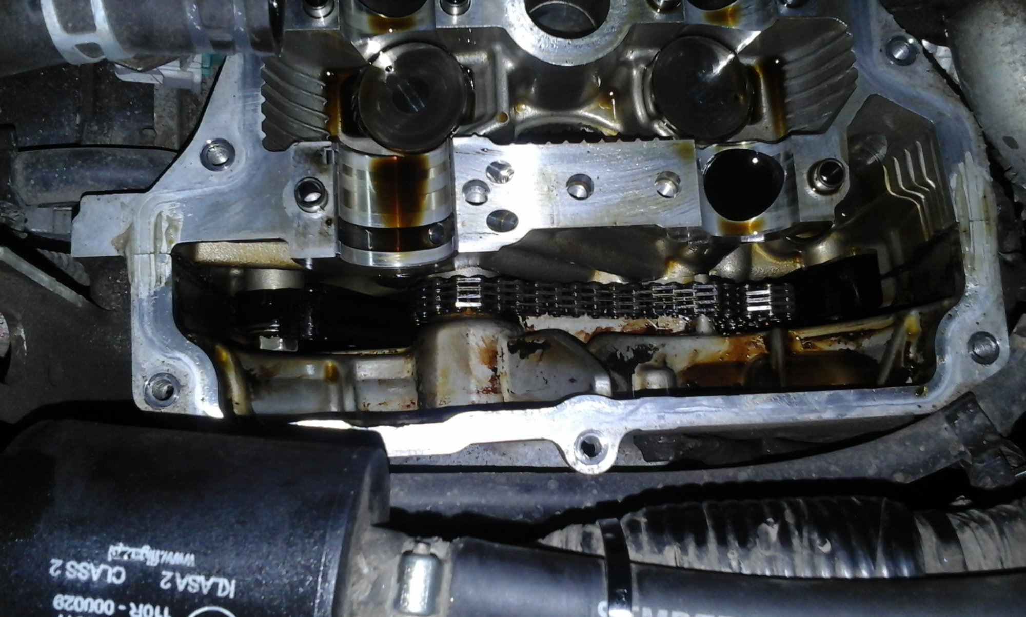 Собираем все в обратном порядке. После установки валов и цепи, смотрим на момент совпадения всех меток, если все хорошо двигаемся дальше. Перед установкой клапанной крышки, счищаем острым ножом герметик в месте стыка лобовины цепи ГРМ и блока двигателя, ссзади на блоке двигателя в районе полукруглых желобков ( будьте осторожны не уроните части герметика в головку, если уронили пинцет в помощь. Обезжириваем и снова в эти места наносим герметик. Одеваем крышку, крепим проводку, одеваем разъёмы на катушки зажигания, вставляем две трубки обратно и одеваем ремень. Заводим и наслаждаемся ровной работой движка.
