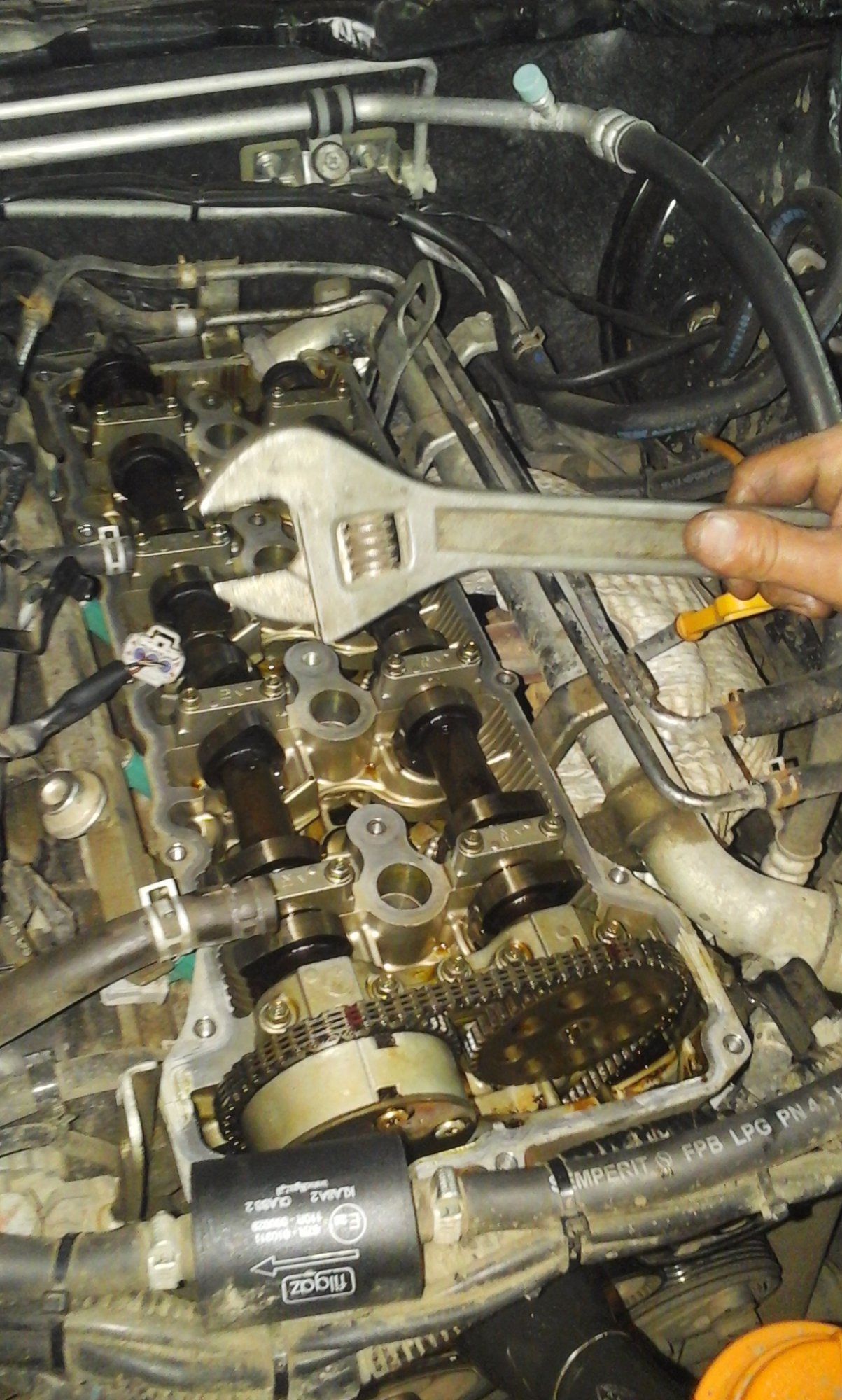 Откручиваем болт звезды выпускного распредвала накидным ключом на 14, удерживая распредвал посередине за квадрат разводным ключом. Снимаем её, потягивая на себя, будьте осторожны там есть шпонка не уроните её в двигатель. В момент когда я снял звезду раздался щелчок проскочившей цепи. Я труханул, и мысленно уже предвкушал как я буду снимать лобовину цепи и выставлять все метки заново. И главное на х.. я купил этот ключ для цепи. А нет я оказался не прав, брат сказал, что это пружины впускных клапанов повернули впускной распредвал и его муфта щелкнула о цепь, так как другой звезды уже не было и цепь оказалась свободна.