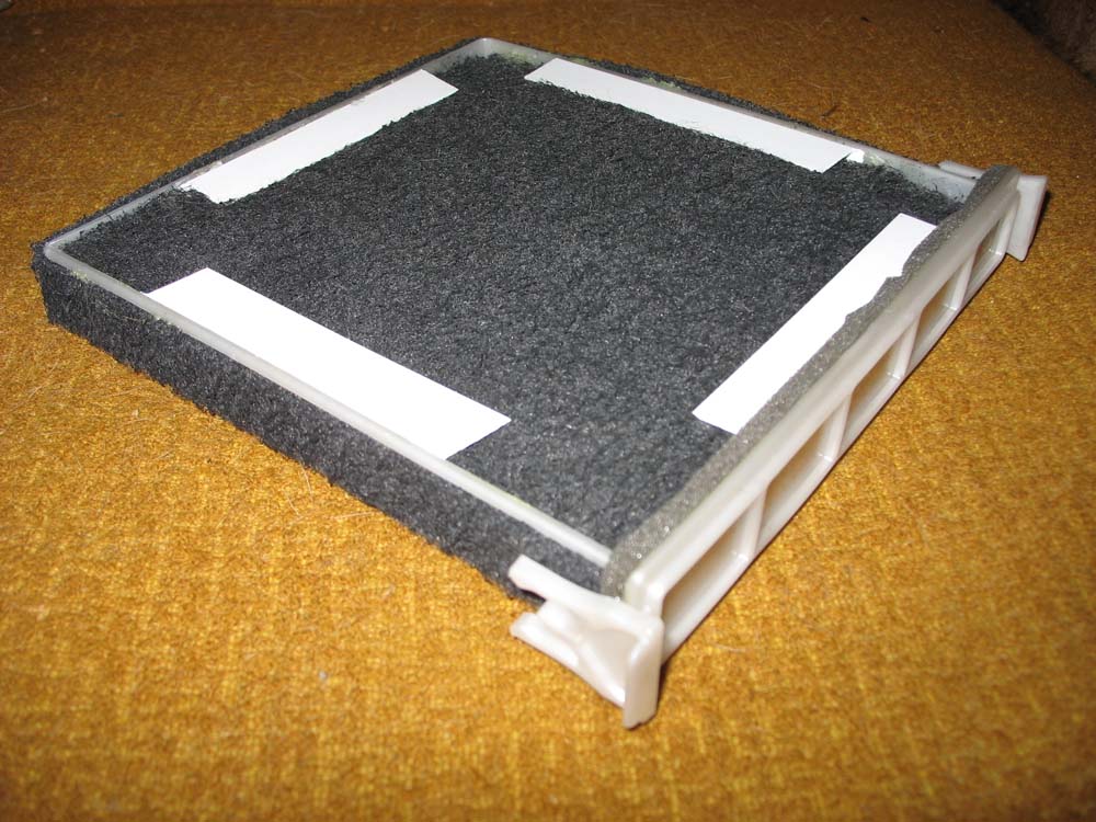 Если обратить внимание на родной фильтр и посмотреть на него на просвет то можно сразу понять что толку от него даже как пылевого фильтра мало, защищает он разве что от листвы и от комков грязи. Мой будерброд в качестве пылевого фильтра будет гораздо эффективнее (уж поверьте на слово занимаюсь по долгу службы системами фильтрации газов). И основное это конечно фильтрация от различных бензольных цепочек, продуктов сгорания топлив и т.д. которые повсюду летают вдоль оживленных автострад, лучше угля вю эту дрянь никто не отсорбирует, если кто пользовался угольными респираторами в помещениях с кислотами тот меня поймет, уголь весчь. Собственно если бы не жена я бы и не делал так как езжу и впринципе терплю всю эту вонь как и большинство водителей, а она уже не может в силу ряда причин дышать (особенно в тоннелях на третьем кольце в пробке). Оригинальный фильтр сделан гофрированным для того что бы увеличить площадь поверхности фильтра и тем самым по максимуму уменьшить сопротивление воздушному потоку. Гофра ни как не влияет на качество сбора мусора, тем более поток через ту часть системы воздухораспределения куда вставлен фильтр идет сверху вниз, таким образом крупный мусор что на штатном фильтре что на моем будет просто собираться сверху и никуда падать не будет и при очередной замене угольных элементов все это просто выбрасывается вместе с элементами, т.к. они в отличае от штатного фильтра уж точно одноразовые и долго эксплуатировать их сверх нормы просто опасно т.к. всю пакость которую они впитали в себя после переполнения могут отдавать обратно.