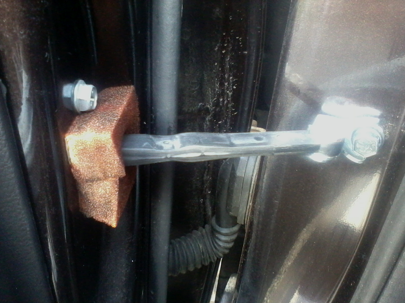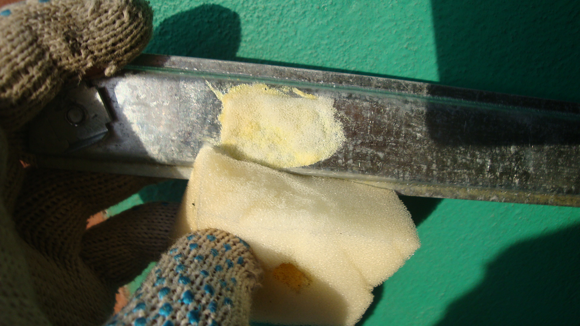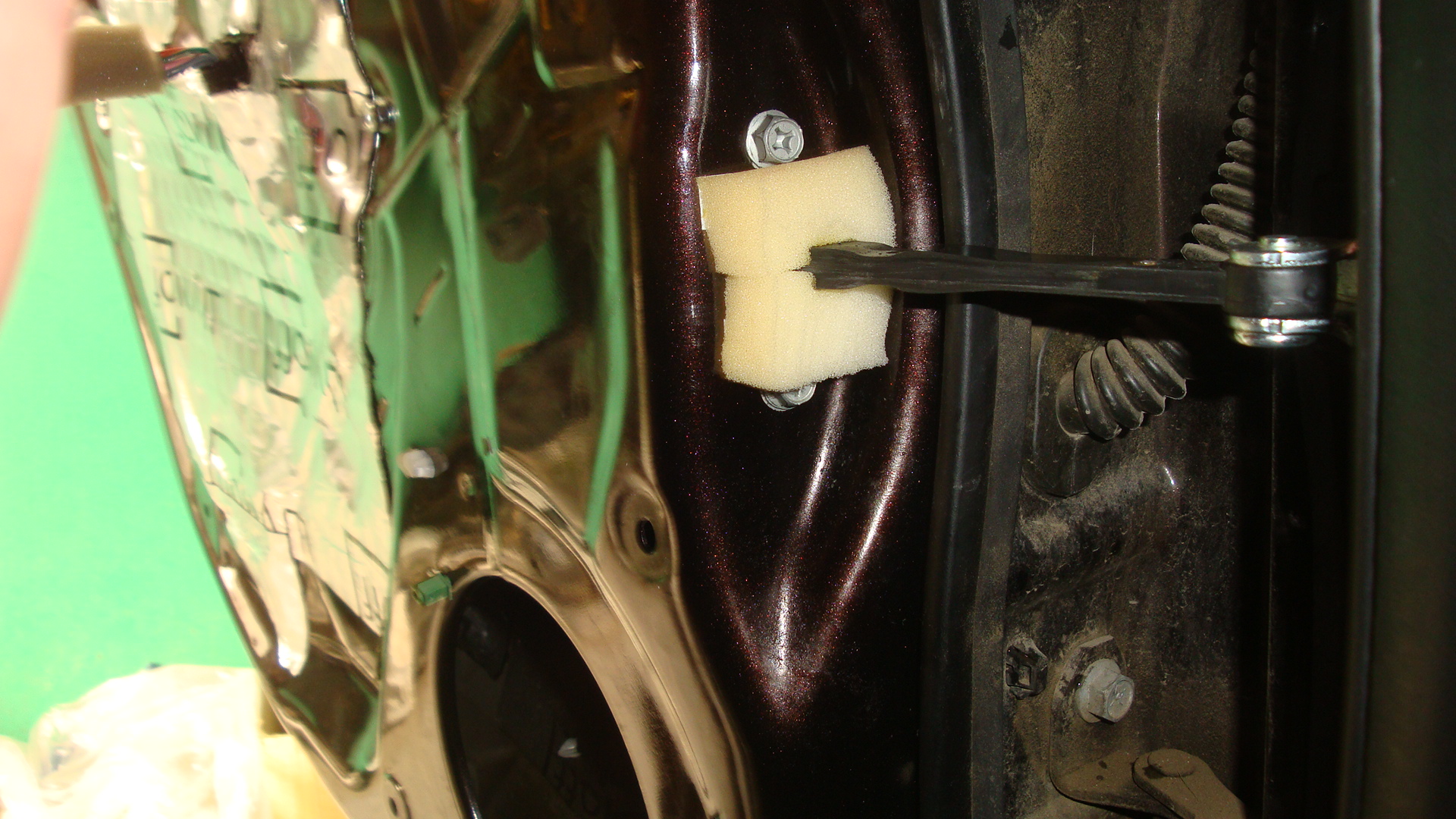 Но во всех перечисленных случаях,пыльник установлен на самом ограничителе(т.е внутри двери).Я ставил цель:простота повторения,легкодоступность используемых материалов и установка пыльника с наружи(т.е без снятия обивки двери).Первый вариант был очень прост.Взял звукоизолируюющий ,самоклеящийся материал на основе вспененной резины под названием Шумофф Комфорт 6(оставшийся после шумки багажника).Но оказалось,что клеевой слой,видимый через щель