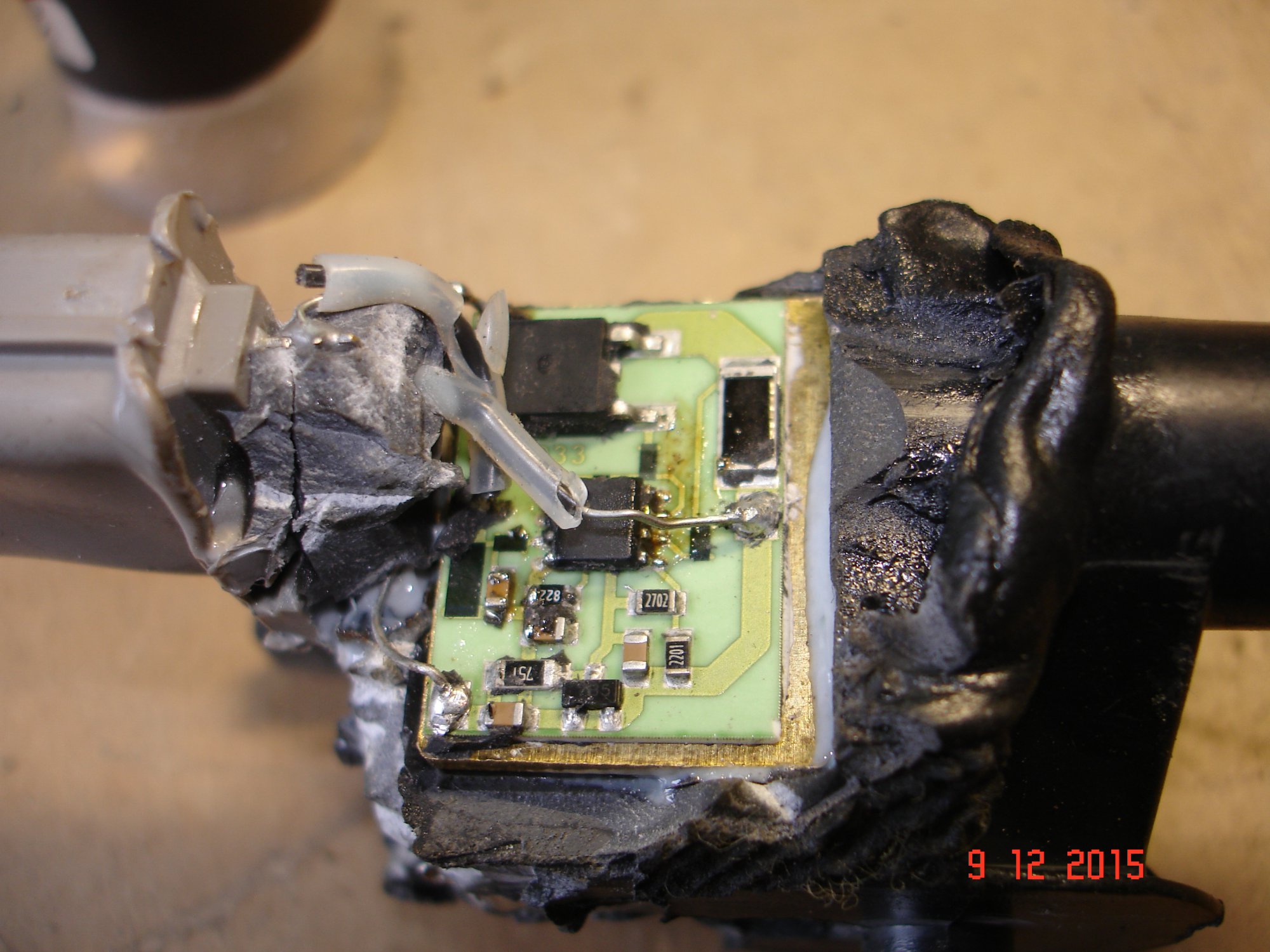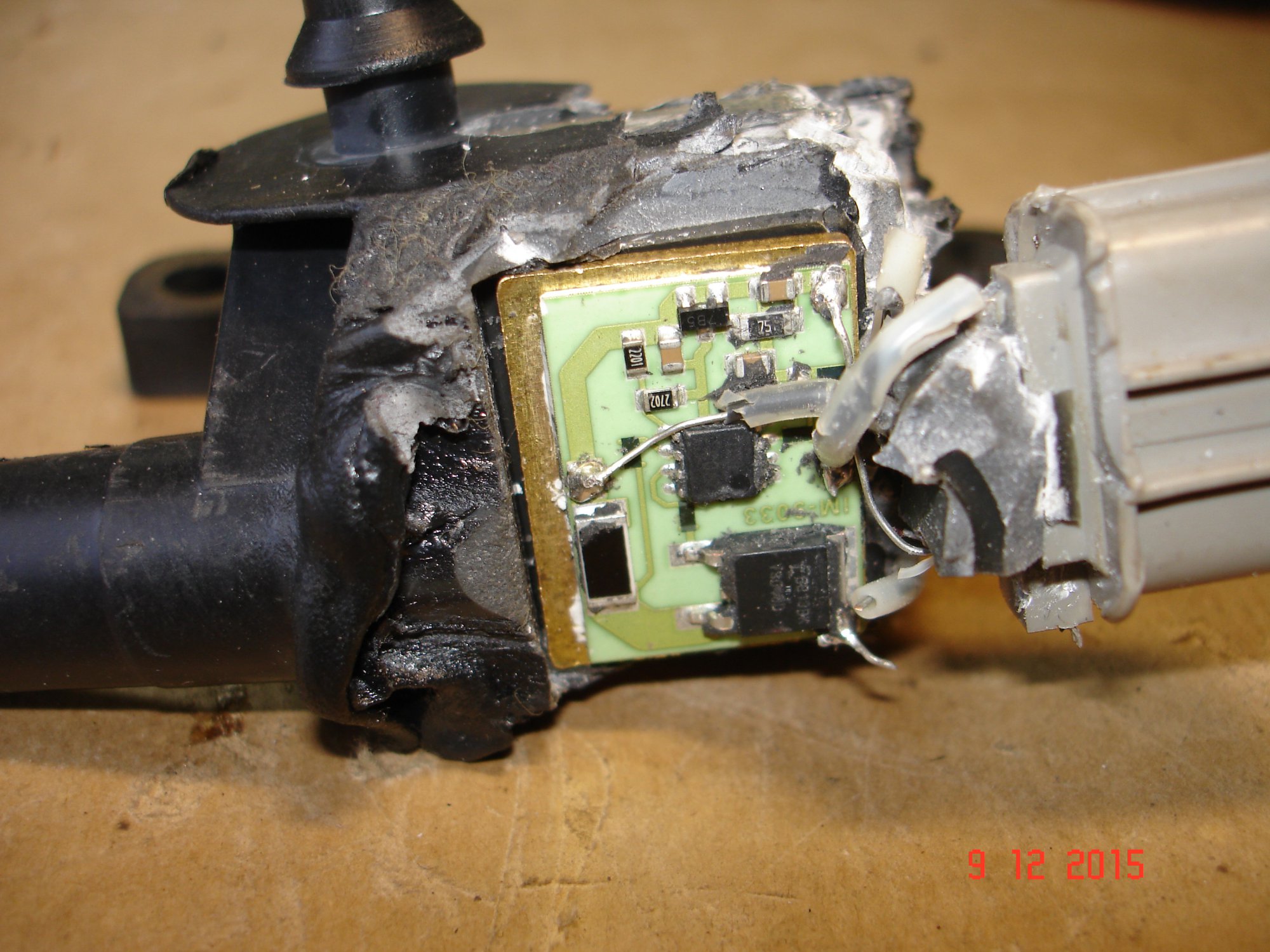В зазоре сердечника пластина постоянного магнита (блестящая).Тут заиграл азарт ,а что если попробовать восстановить? Пропаял,погрел феном, закрыл плату слоем резинового авто- герметика ,как и было изначально,затем стой эпоксидной смолы (было написано на упаковке что для металла),затем был сформирован корпус холодной сваркой (-60 - +150 градусов) .Все это покрыто слоем спрея PLASTIK вместо лака,как доп. изоляция ,электро и гидро ,и в три слоя фторопластовой ленты по 0,1 мм прокладка,с надеждой что усилится электроизоляция от железа..(как говориться лучше перебздеть ,чем недабздеть).Ведь там ,по шинке видимо появилась трещина ,и прошило.