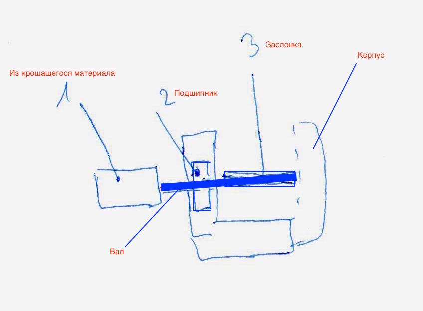 После промывки на СТО дроссельной заслонки (29.11.2017) и всего прилагающегося все заработало, глюки с холостым ходом полностью пропали. Однако, когда делалась чистка на СТО было обнаружено (предположительно) разрушение подшипника (фото, к сожалению, нет, но изобразил на схеме по памяти, №2 на рисунке). Симптомы - этот вал (синим на рисунке) движется рывками. Все было смазано, но было понятно, что это ненадолго. И вот спустя неделю возврат симптомов с холостым ходом в полной объеме.
