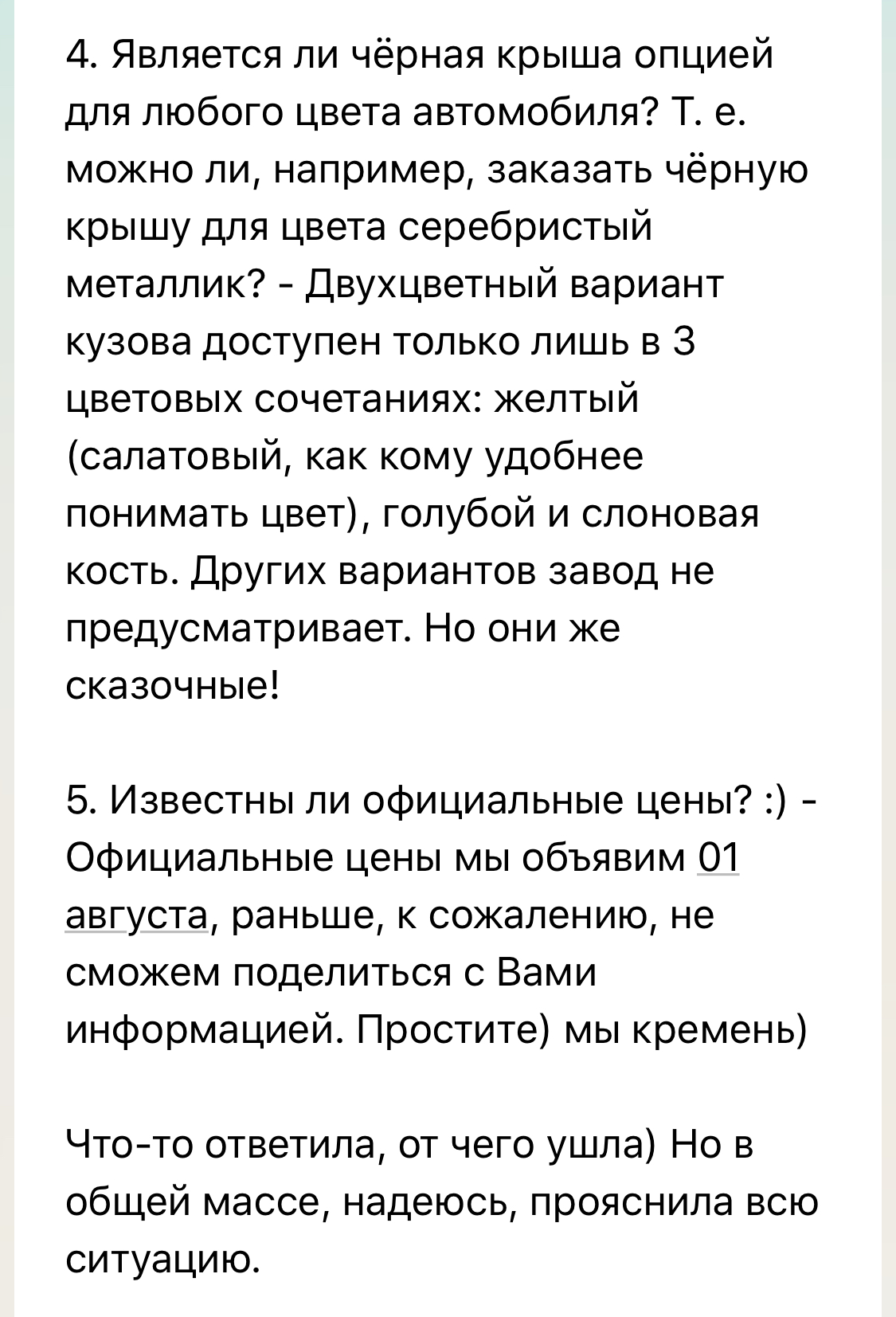 А допах тысяч на 100 к основной цене он не заикался?Поговорил с менеджером - сейчас ими получена небольшая партия, есть даже одна свободная машина, правда черного цвета. Следующая партия (большая) ожидается в конце августа - начале сентября. Стоимость максимальной комплектации - 1600 т.р. (+ доплата за цвет). Такие дела.