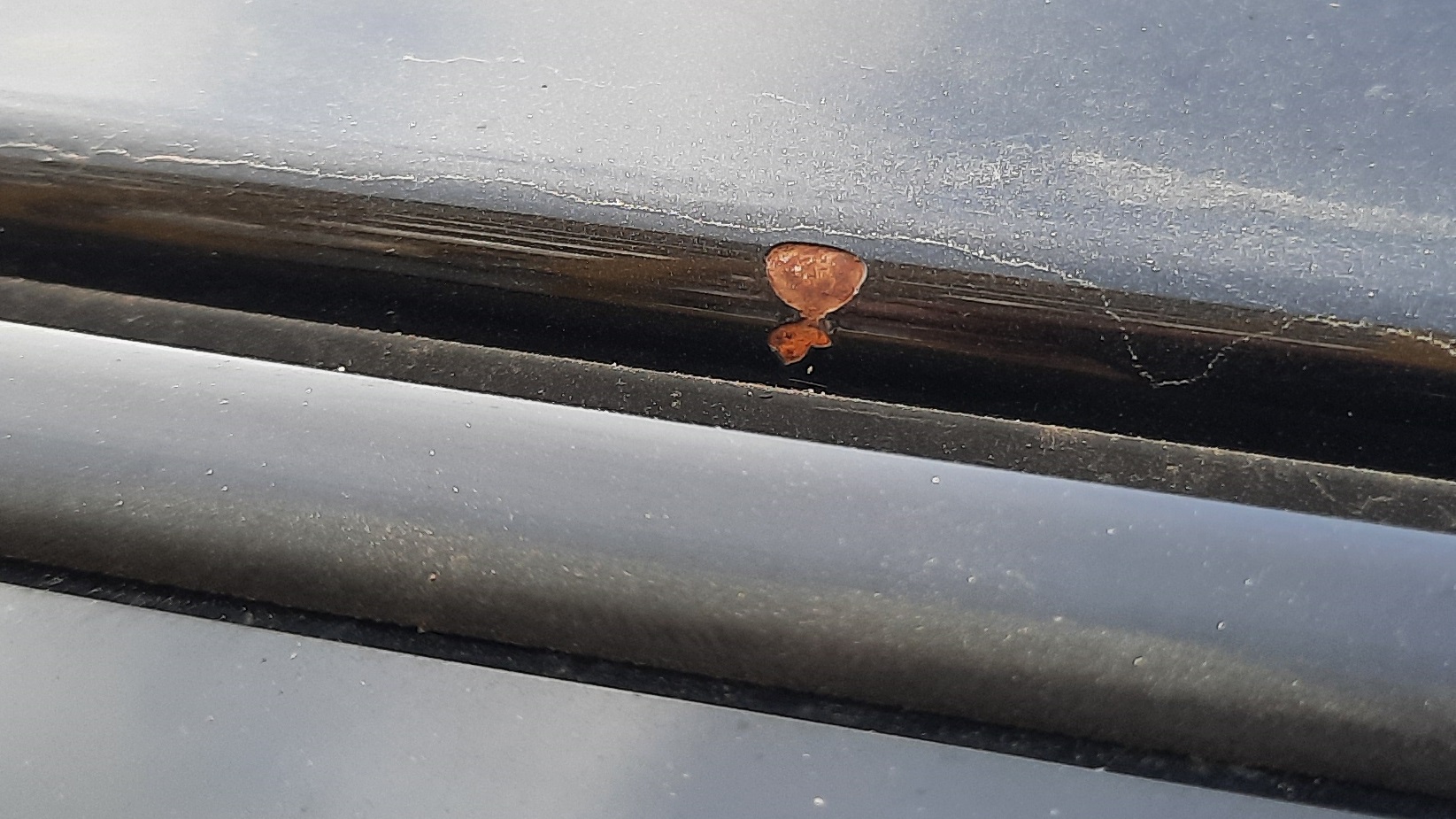 3. Сразу после этого обнаружил скол на передней кромке крыши, приличный по размеру. Вроде бы скололась только краска, без деформации металла, но следов грунта не обнаружил. Практически сразу начало ржаветь - ни разу не фигня, учитывая место скола (фото ниже). Там же на кромке обнаружил еще пару мелких сколов. Сделал трудный выбор в пользу покраски всей крыши (сильно не пинайте).