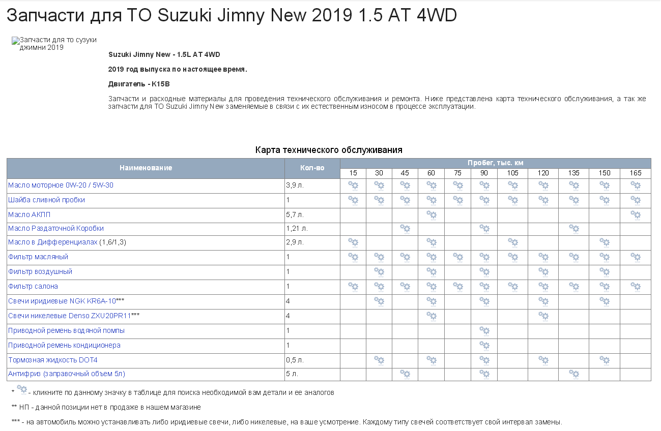 У меня инструкция и сервисная книжка в машине. На Сузуки Джимни 2019 г. на ТО-1 идут замены: Моторное масло и масляный фильтр, масло в мостах, салонный фильтр. Может у Вас Джимни прошлого поколения или инструкция не для рынка РФ.Завтра сфоткаю ее обложку и таблицу ТО, выложу тут.Но вот смотрю на стр. 10-25 Инструкции по экспл. и вижу, что на 15 ткм по Фильтру кондиционера стоит прочерк.