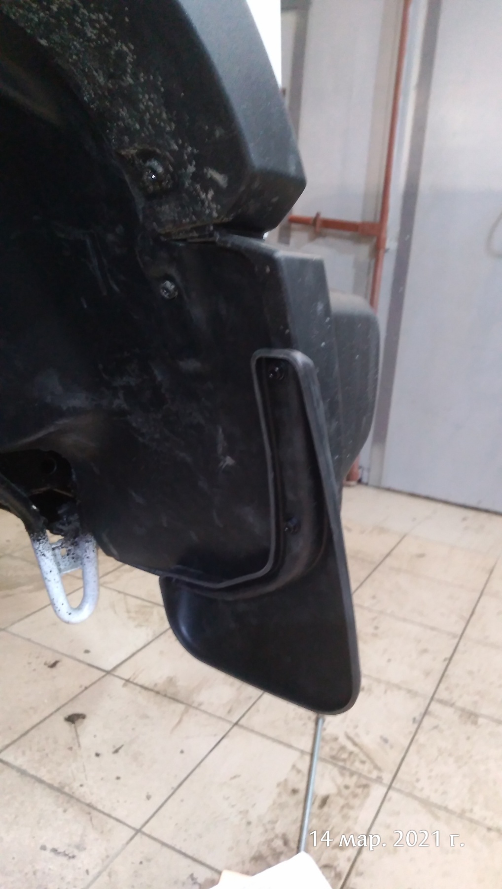 Верно. Брызговик крепится в 4-х точках. Две вверху к внутренней от колеса. Не фотографировал - там всё в порядке. Там клиент видит при покупке, у него не должно быть поводов придраться. А вот две других точки - внизу и крепится в нашем случае к нижнему бамперу. Без подкрылка легче, а с ним надо чуток голову поморочить. Если она есть, конечно.... Но зачем? Разве задача продать нормальную машину? Не-е-ет... клиент должен не вылезать из сервиса! Думаю, поэтому и клипс (пистонов) снизу штук пять недосчитался... Всё это я уже давно заметил, но ждал клипсы (пистоны) из Китая. В Кунцево на авторынке попробовал искать, но 6-ки, например, не нашел. Зато теперь у меня их "ну просто завались"