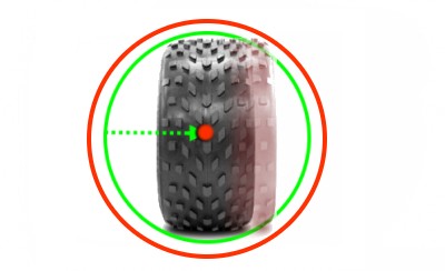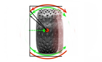 Красное (полупрозрачное колесо) с меньшим вылетом, но так как ступица прежняя, центр вращения прежний, соответственно окружность описываемая колесом больше (красная)