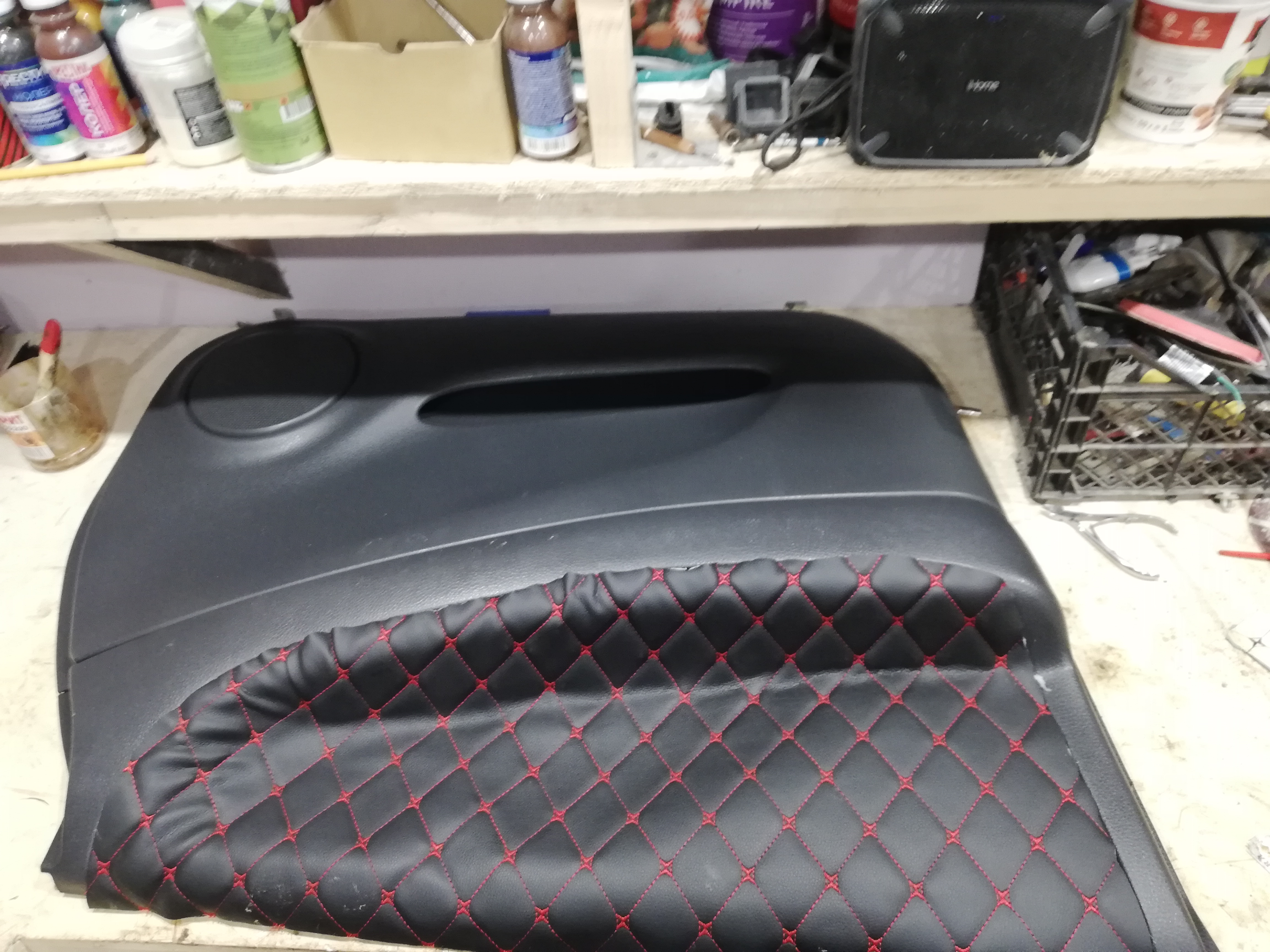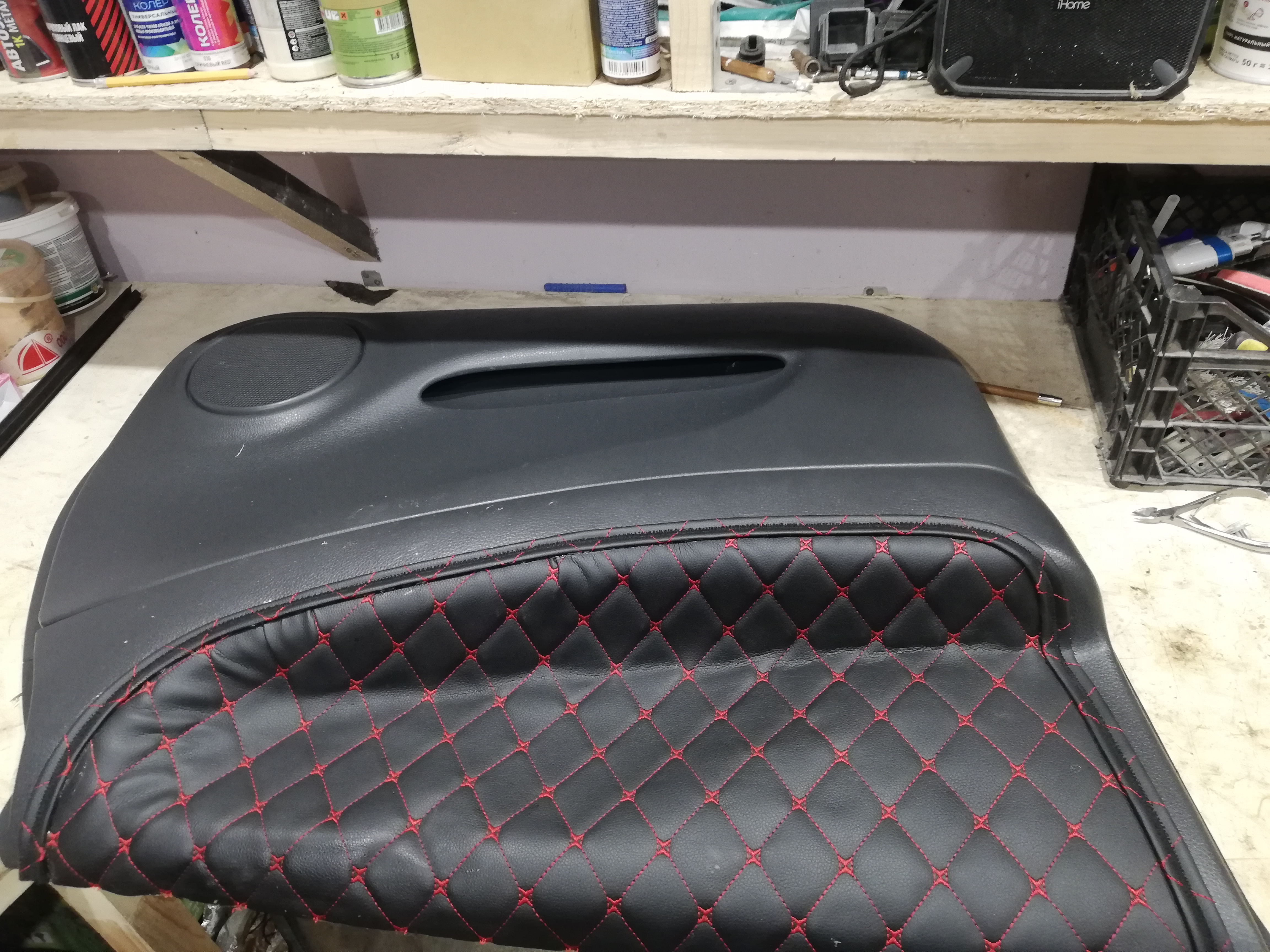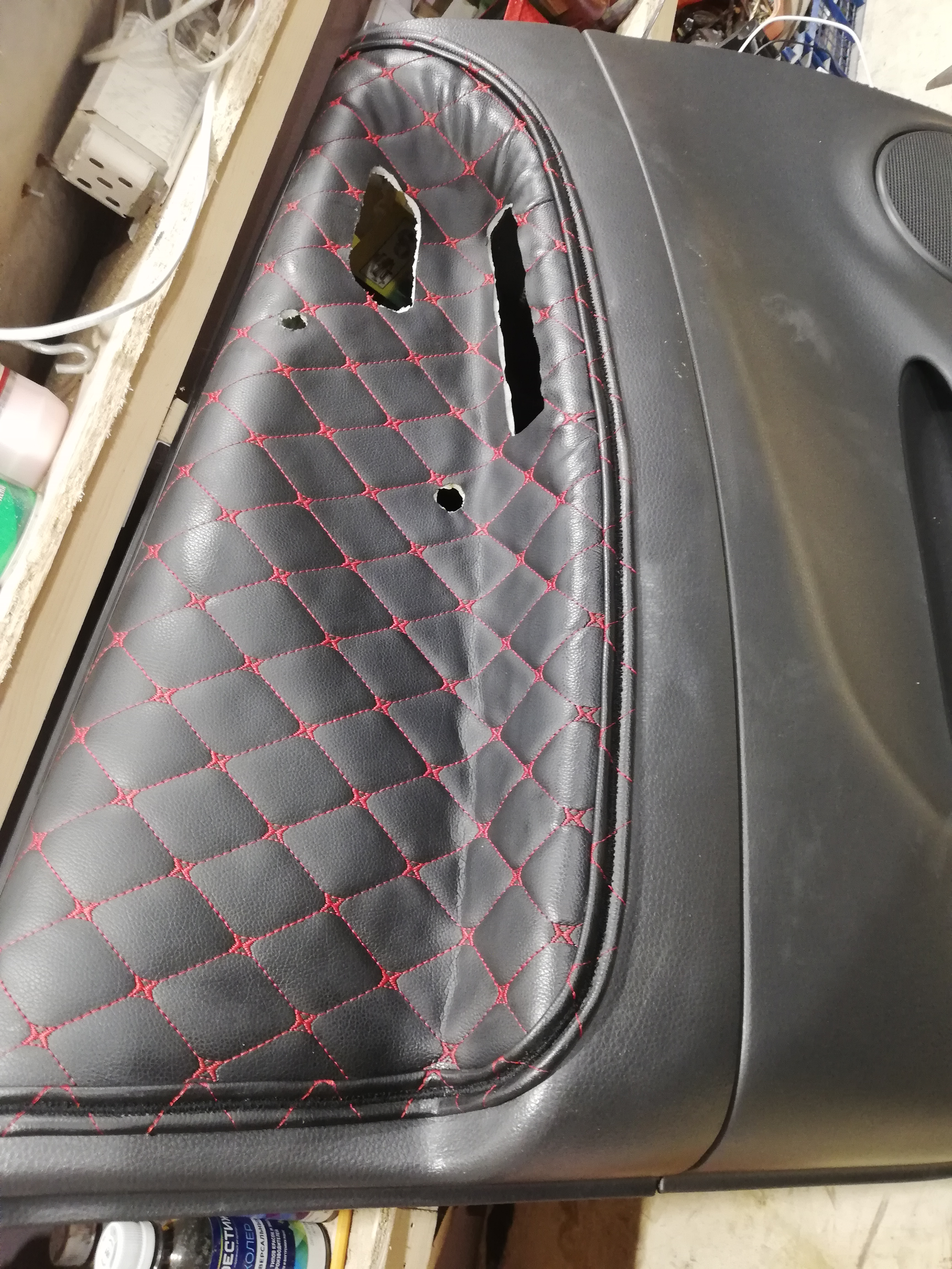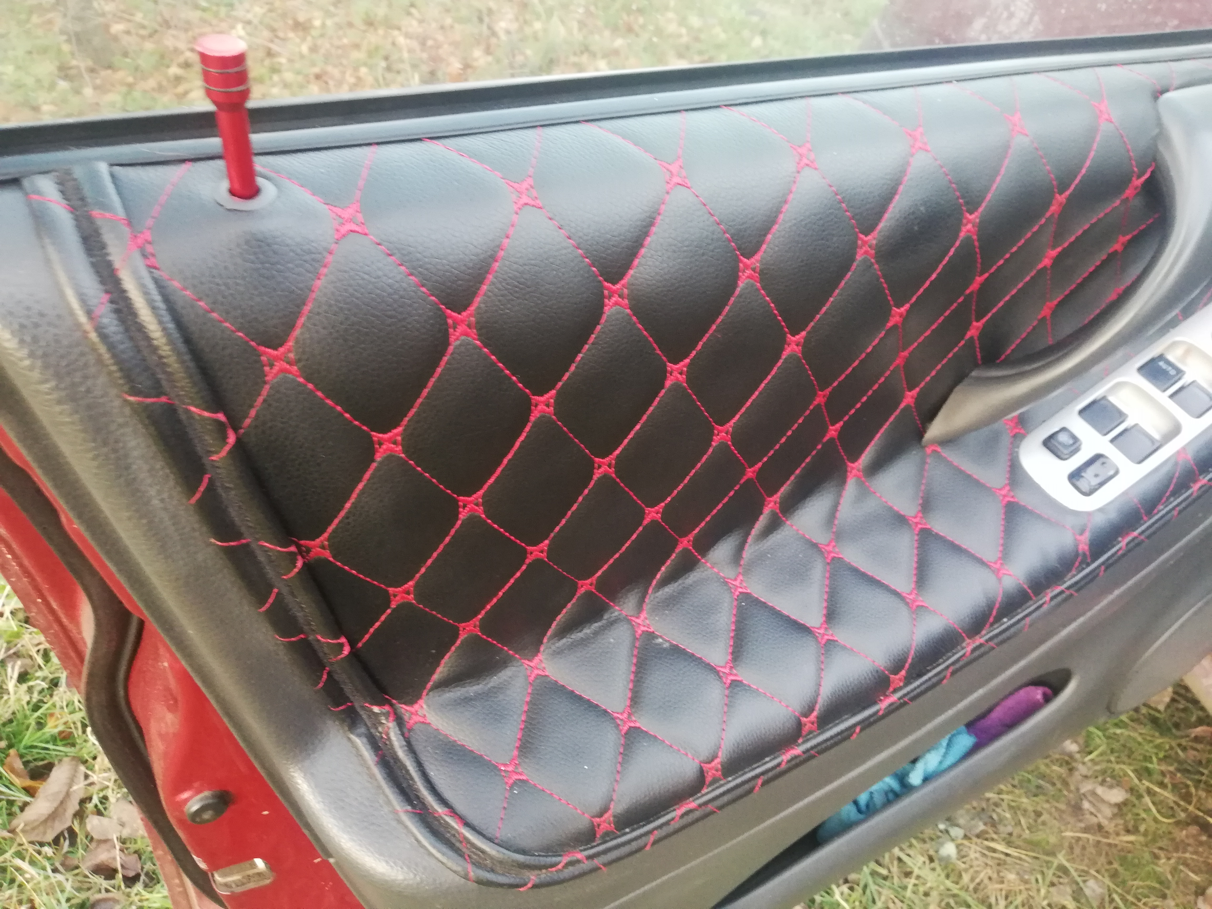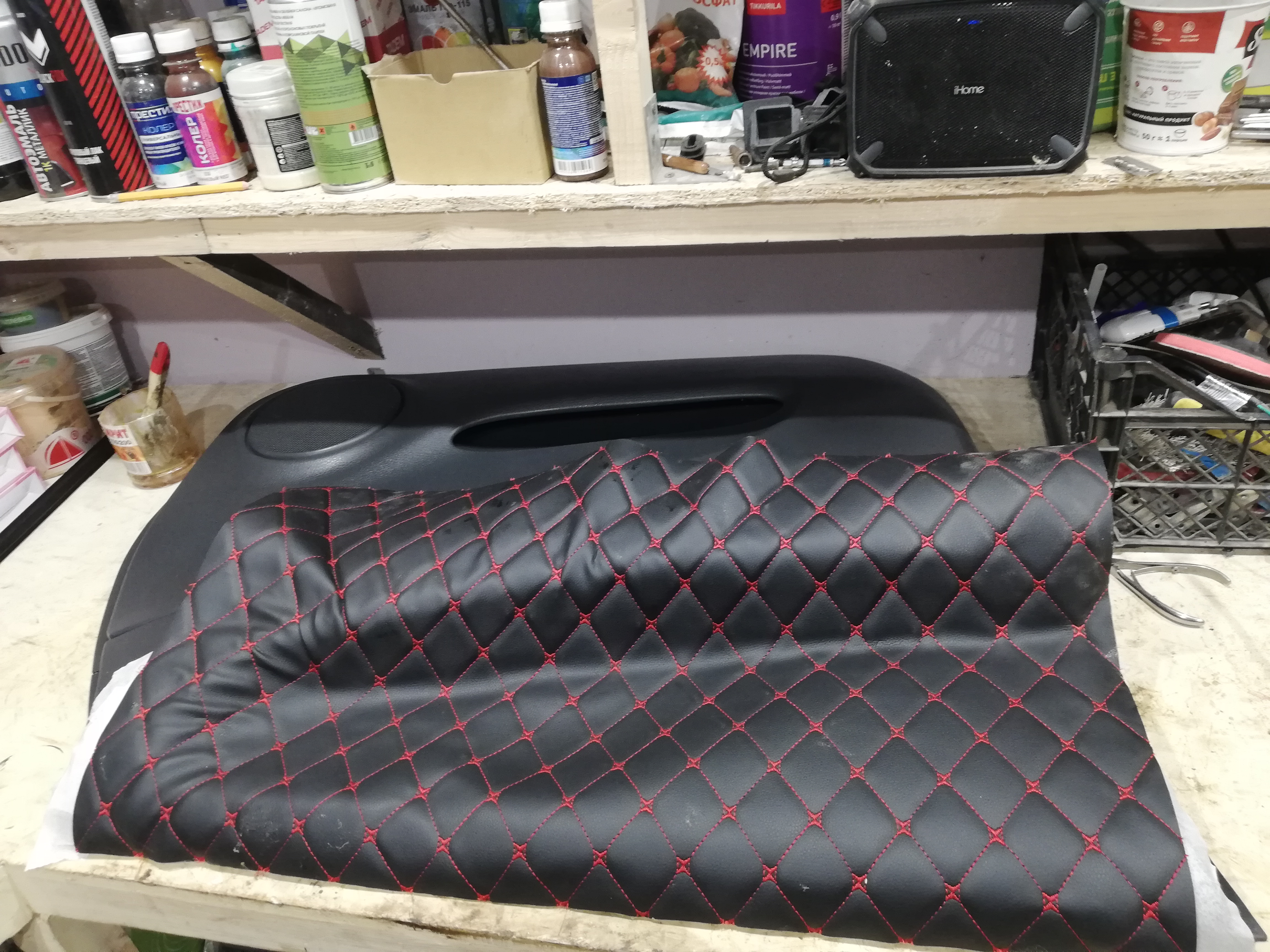 Сначала снимаем конверт (как снять есть куча инфо.), берем обшивку обезжириваем, прикладываем ваш материал и вырезаем его с маленьким запасом по размеру чтобы потом было удобно клеить, ЕСЛИ ЕСТЬ РИСУНОК нужно вырезать так чтобы все двери были одинаковые!Клеим малярный скотч и наносим клей на обшивку и на ткань, делаем все по инструкции для вашего клея, я ждал мин. 5 а потом клеил! Клеить нужно от стороны где стекло продвигаясь к ручке. После того как вы все разгладили и приклеили берем степлер и начинаем степлерить прямо по линии углубления обшивки! Затем ножом обрезаем все лишнее по контуру. Берем кантик который вы хотите чтобы закрыть ваш контур между концом пластика и обшивкой(я сделал из того же материала сшив его на швейной машинке, можно закрыть чем угодно начиная от уплотнителя в цвет или купить готовый молдинг можно зайти в швейный и подобрать на ваш вкус) и клеим его по контуру тем же клеем.Выжидаем пока все подсохнет затем вырезаем все окошка аккуратно ножом с маленьким запасом в пару миллиметров. Берем уплотнительную резинку нашего окна и аккуратно отверткой заводим материал под резинку как на фото.Вытираем остатки клея ацетоном и все готово.