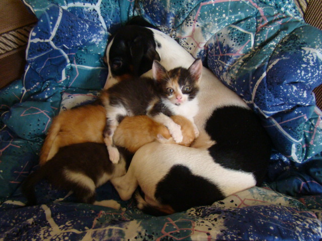 Много раз читала, слышала, истории, когда кошки выкармливали щенят и собаки выхаживали котят. Теперь перед моими глазами собака вылизывает четверых пушистиков. Те ползают по ней в поисках сиськи. Еще слабенькие, тычут мордочками в вымя, пытаясь найти сосок, еду, тепло и заботу.