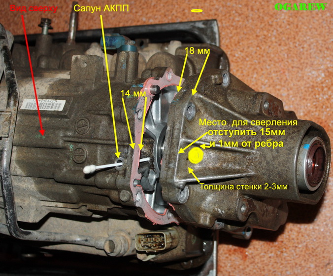 Извини,но я что-то не понял-будто перевод с английского на русский через Гугл..сапун выходит в пустоту задней крышки на хвоставике коробки, где ничего нет. ее можно снять и нарезать резьбу отдельно.