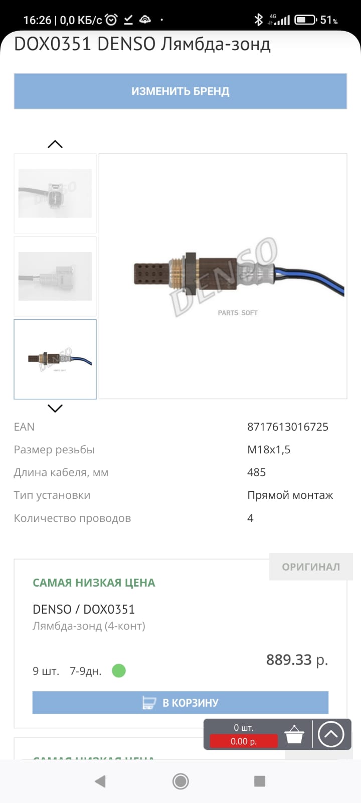 DOX0351, поставил, чек так и не пропал. В сервисе сказали, что сопротивление лямбды 7,7 Ом, говорят либо датчик неисправен, либо неверно подобран, но этот датчик везде идет как замена оригиналу. На форуме писали, что сопротивление должно быть 5,0-6,4 (это для Liana, не знаю насколько справедливы эти параметры для Aerio). Диагност сказал, что раз в мозги зашито сопротивление 5,0-6,4, то при превышении параметров, машина будет выходить в аварийный режим. Какое сопротивление у Denso