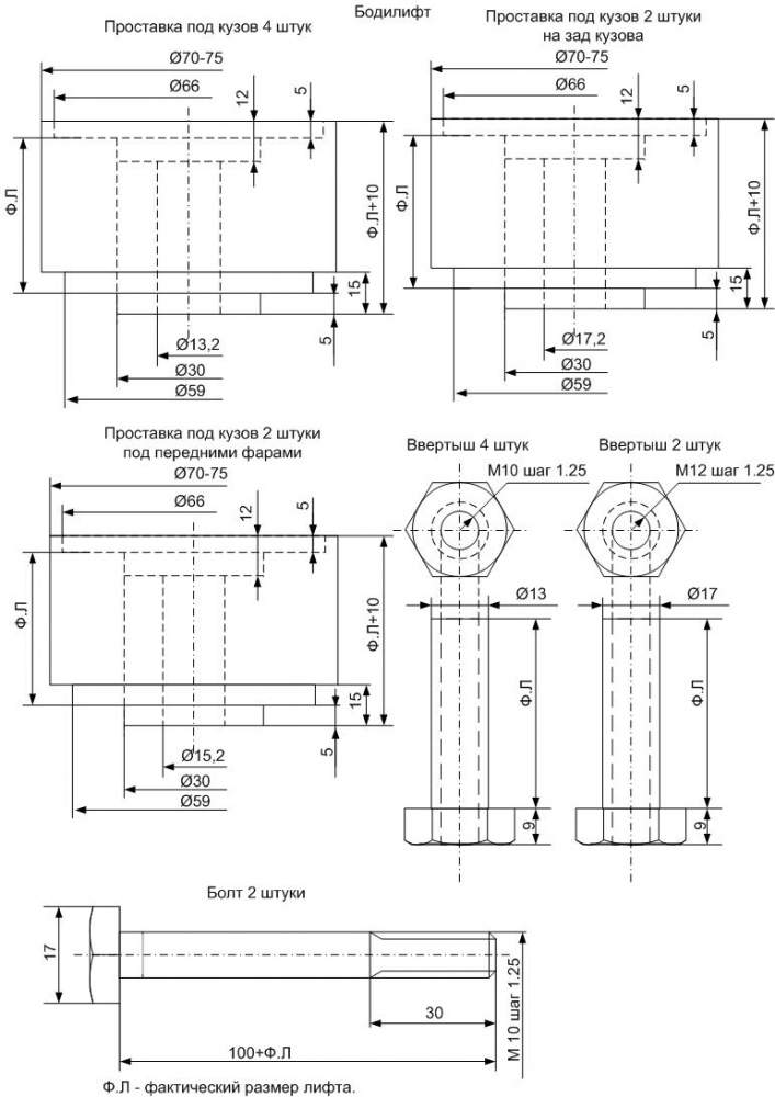 Теперь методика поднятия кузова домкратами. Поднимать надо не по стороне а сначала зад , потом перед, этим минимизируется уход кузова относительно рамы. Понимаем синхронно с помощником по по 2-3 см постоянно следя за уводом кузова. Если у вас не хватает хода домкрата то не отчаиваетесь так и должно быть, просто отпустите один из 4 медленно и кузов останется стоять на трех вполне устойчиво а вы тем временем подкладываете очередной кирпич под домкрат для поднятия кузова еще выше поднимать придется где то на 12-17 см.