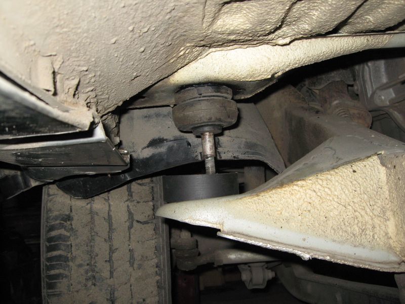 Теперь одеваем сначала проставку потом подушку и приспускаем немного домкраты. Прыскаем вдэшкой на все опоры кузова на раме для того чтобы подушки скользили по металлу и опускались ровно. Опускаем кузов до того момента как можно будет хоть немного насадить на резьбу наш бутерброд из ввертыша гайки и нижней резинки.