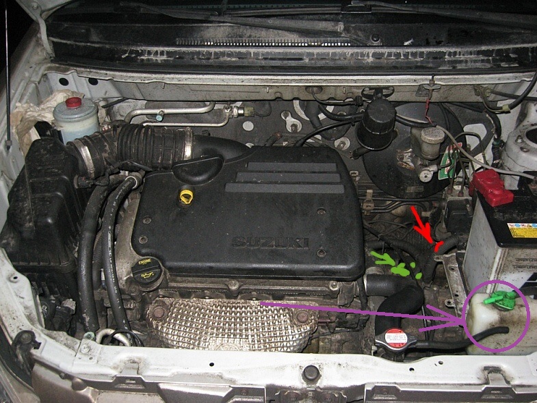2) если знаем что было залито ранее, то готовый антифриз наливаем в расширительный бачек (он выделен фиолетовым кружком) по верхнюю риску HIGH