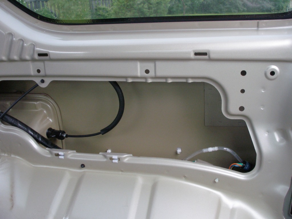 Для начала снимаем задний фонарь(если он есть) диаметр отверстия не помню.. По месту можно определить. Кончик шланга привязываем к тросику или проволочке и пробрасываем в полости двери. Сверлим отверстие, вставляем шланг и писалку и защелкиваем писалку в это отверстие..... Ну как то так наверное....)))